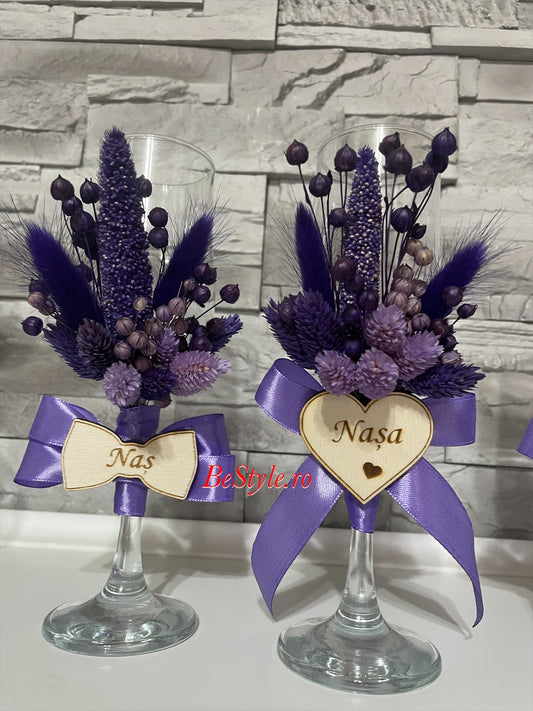 Pahare nunta personalizate, cu flori uscate