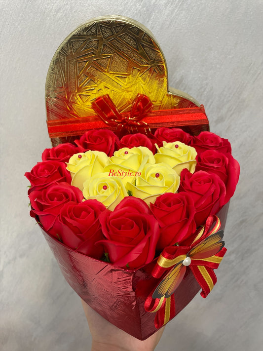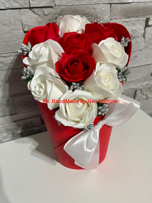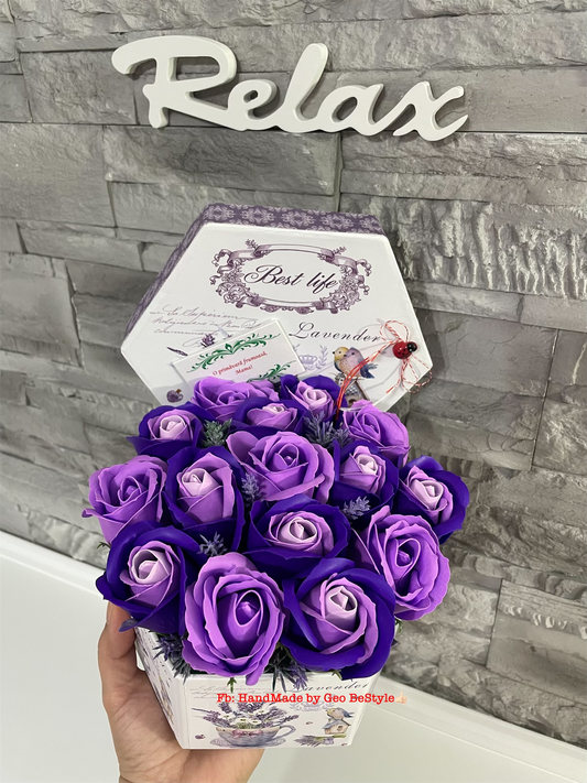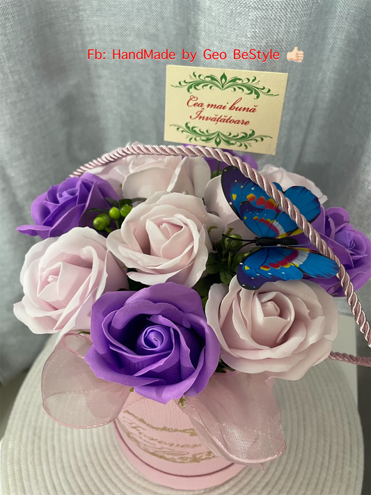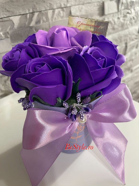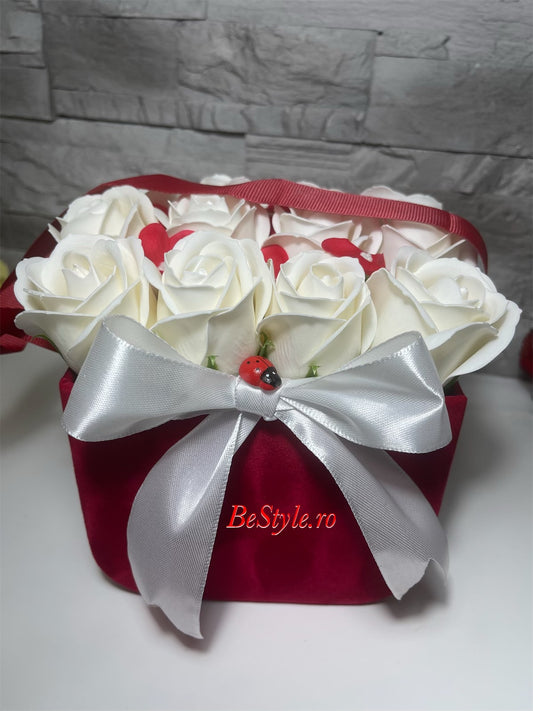 Aranjament cu trandafiri de sapun in cutie de catifea 01