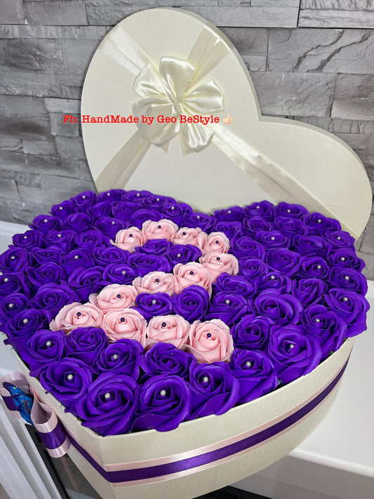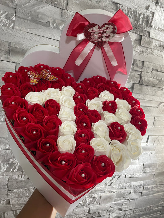 Cutie in forma de inima cu trandafiri de sapun si initiala numelui din perle