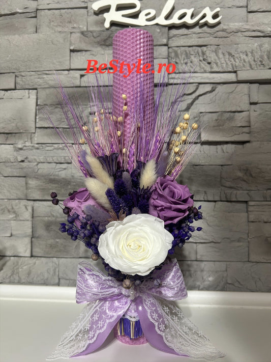 Lumanare botez din ceara naturala cu trandafiri criogenati movi si alb