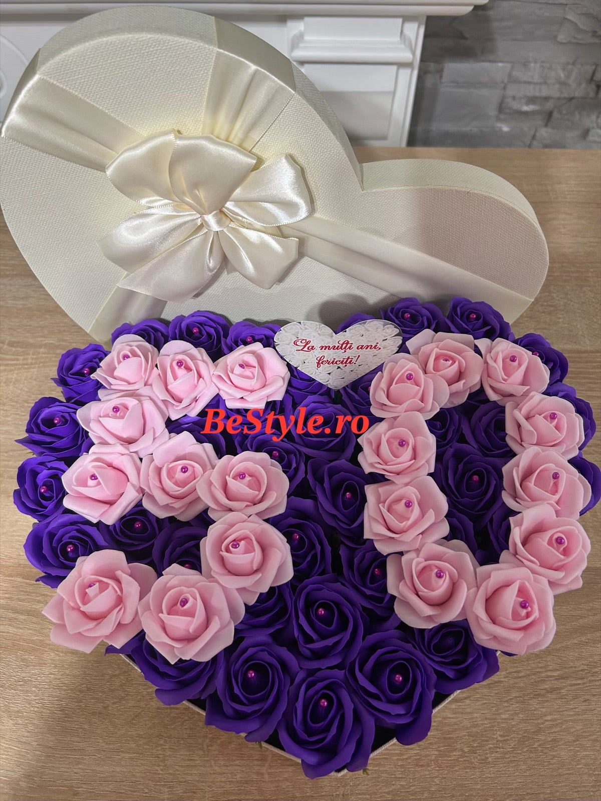 Aranjament floral cu trandafiri de sapun personalizat cu varsta dorita, realizata din trandafiri, in cutie in forma de inima, de aproximativ 32 cm.