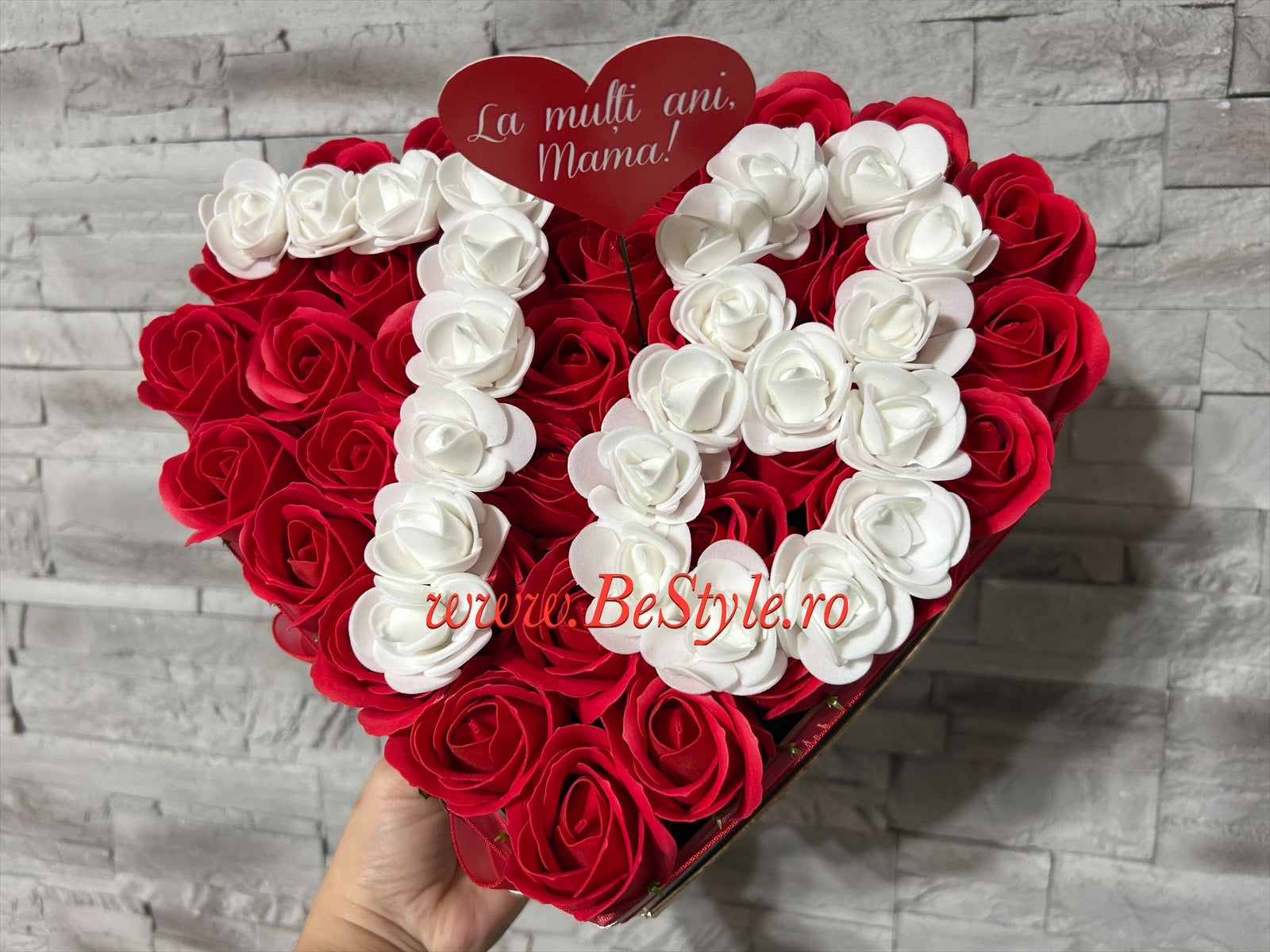 Aranjament floral cu trandafiri de sapun personalizat cu varsta dorita, realizata din trandafiri, in cutie in forma de inima, de aproximativ 27 cm.