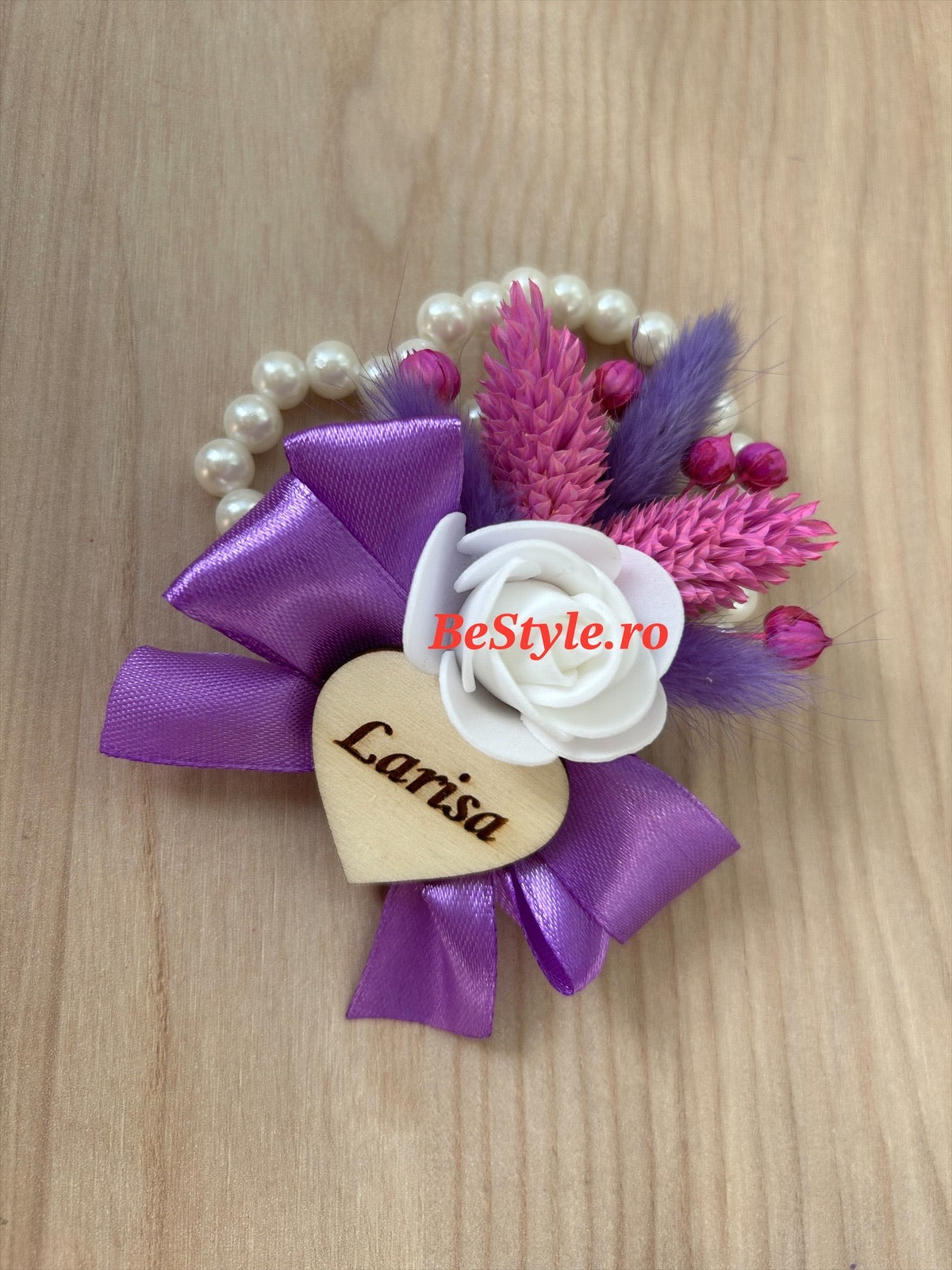 Brățară din perle, decorată cu flori stabilizate mov, lila, personalizată cu plăcuța din lemn.