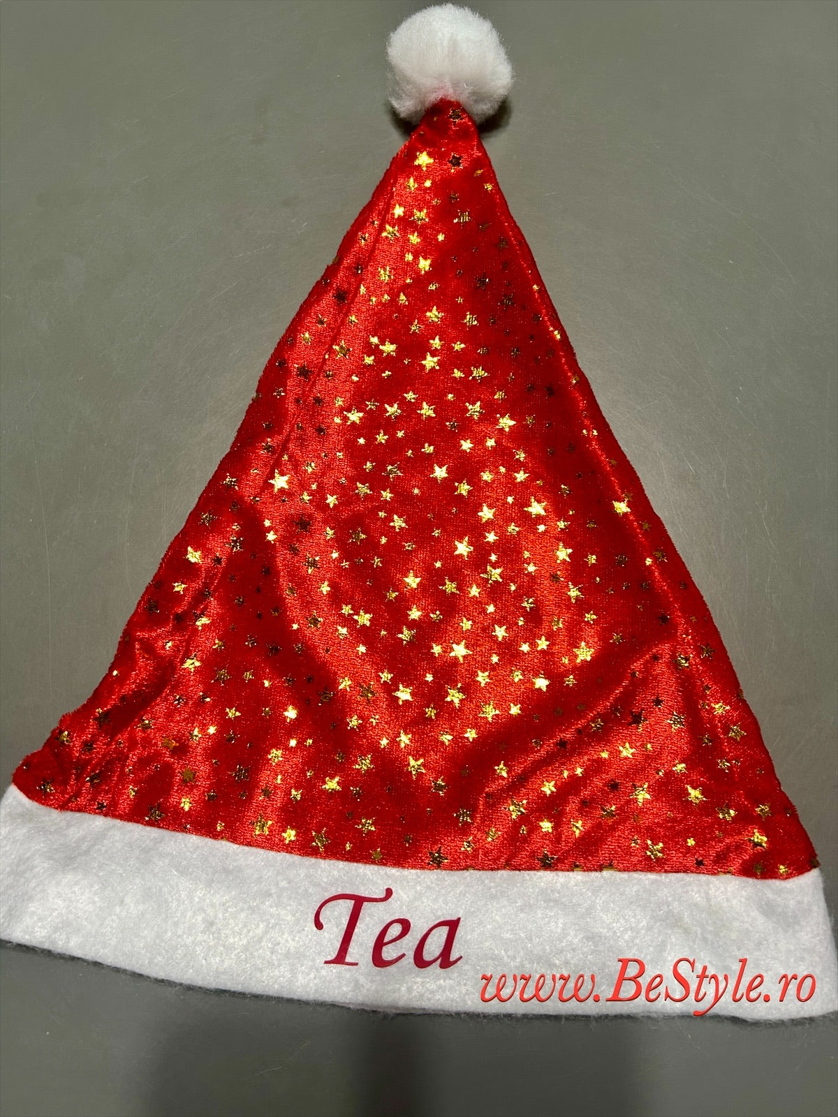 Căciuliță de Moș Crăciun ce se personalizează pe comandă cu numele dorit.