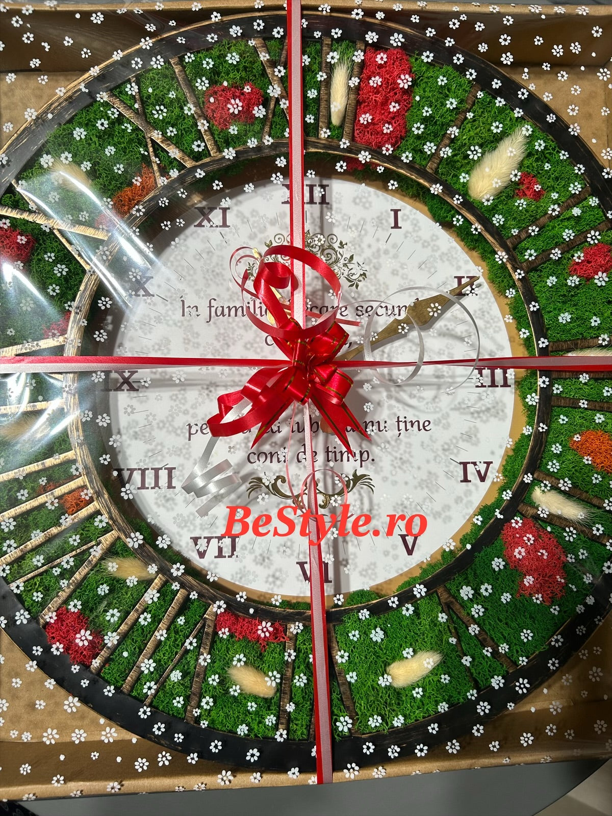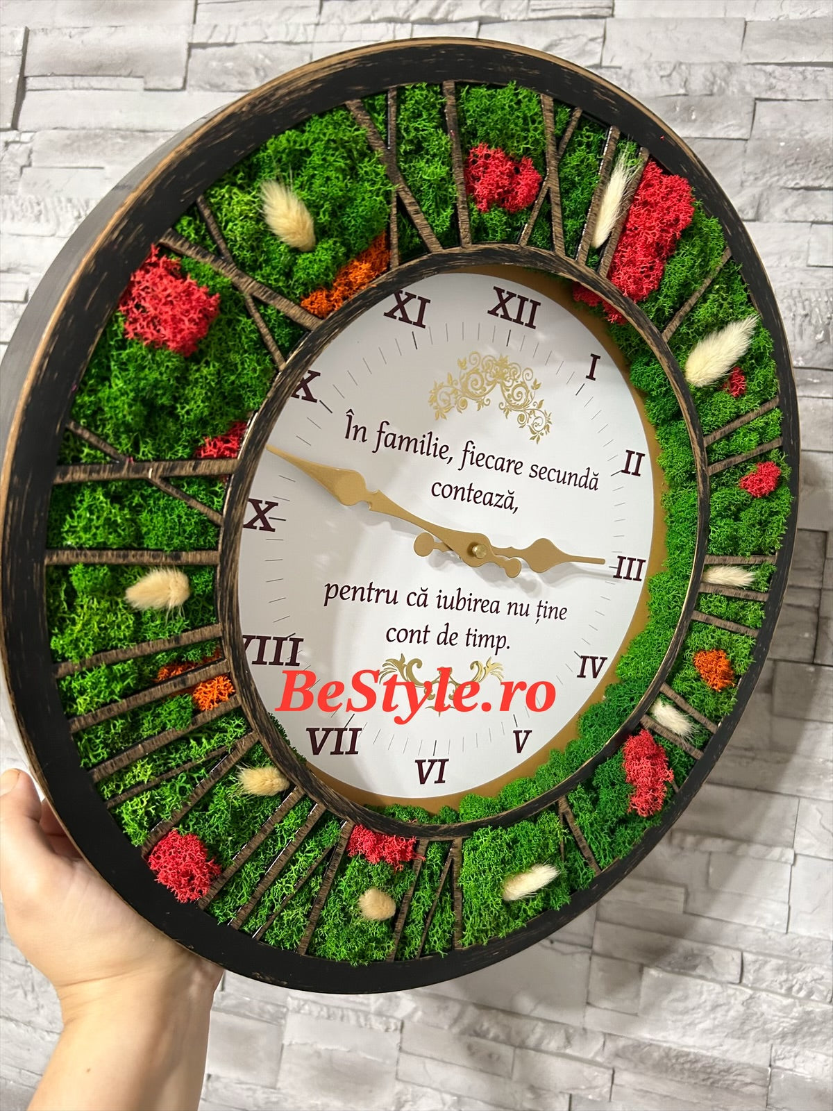 Ceas de perete cu licheni personalizat cu mesaj special pentru familie, de 40 cm diametrul.