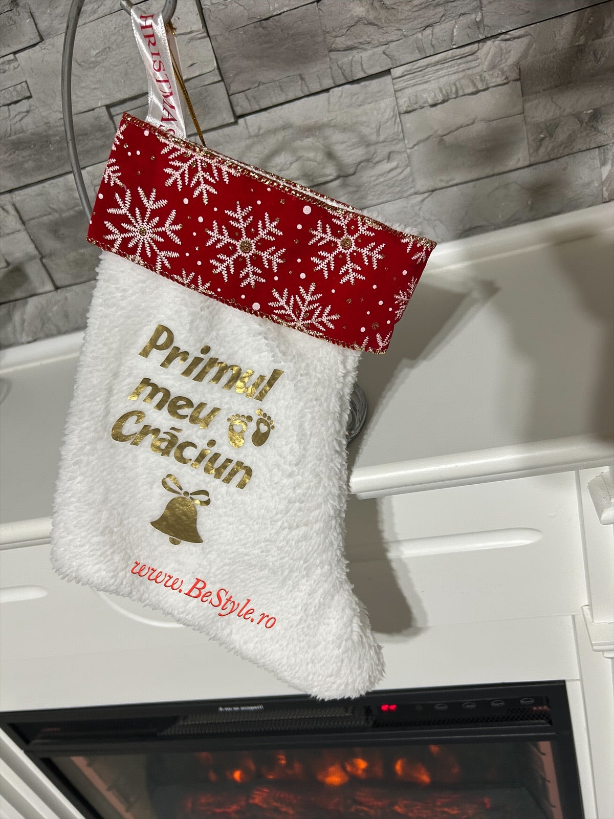 Cizmuliță din blăniță albă, realizată manual după tipar, personalizată cu mesaj “Primul meu Craciun” ~ un cadou ideal pentru nou veniți, decorativa pentru brad, șemineu sau ușă de la camera.