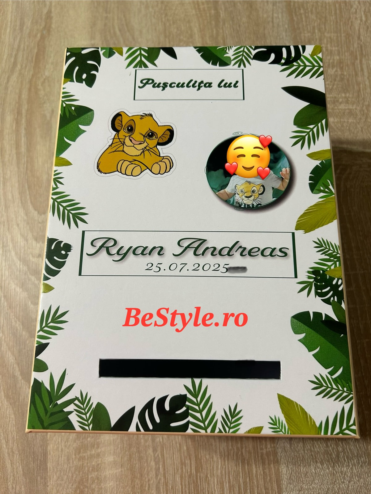 Cutie pentru plicurile de bani folosita la botez baietel, cu tematica Simba, personalizata cu fotografia si numele copilului.