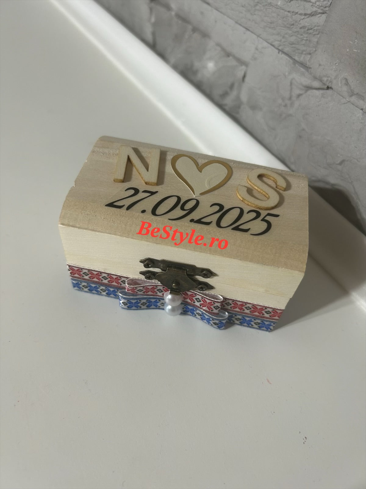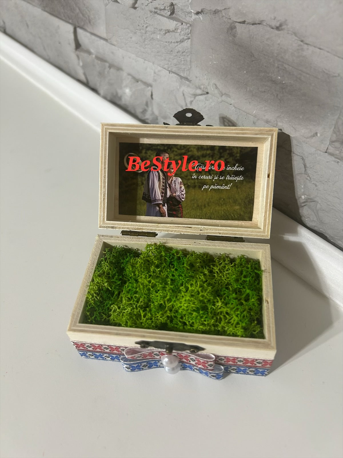Cutiuta tip cufar, din lemn, cu model traditional romanesc, pentru verighete miri, personalizata cu initialele mirilor, data nuntii si un mesaj, la interior cu licheni stabilizati naturali.