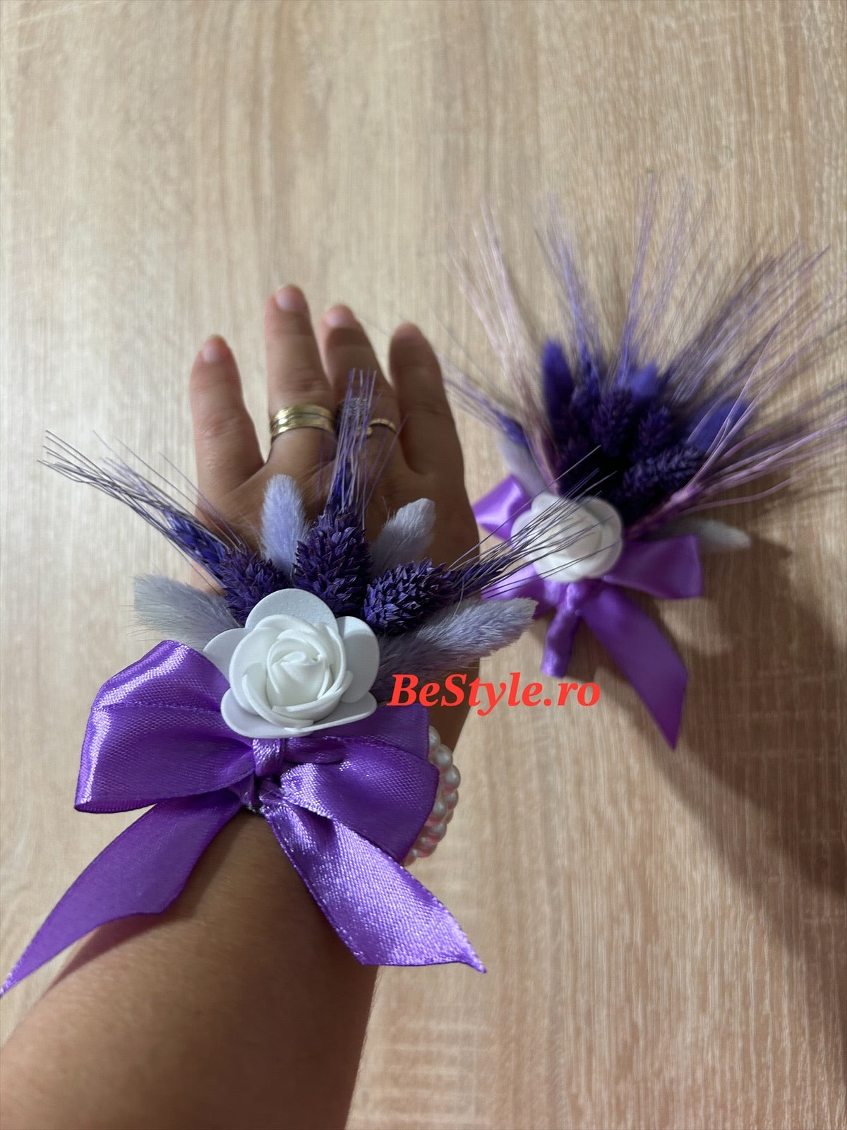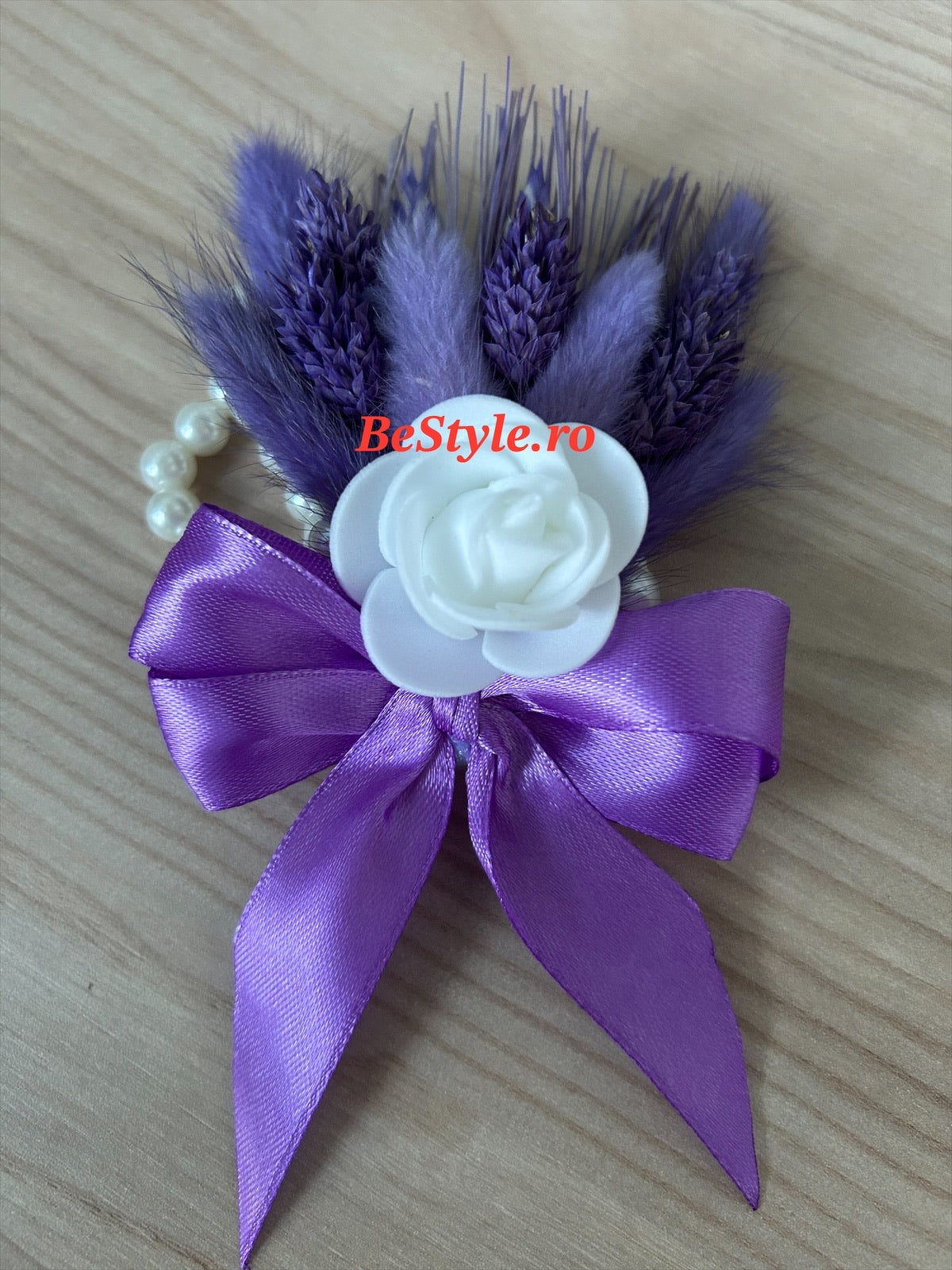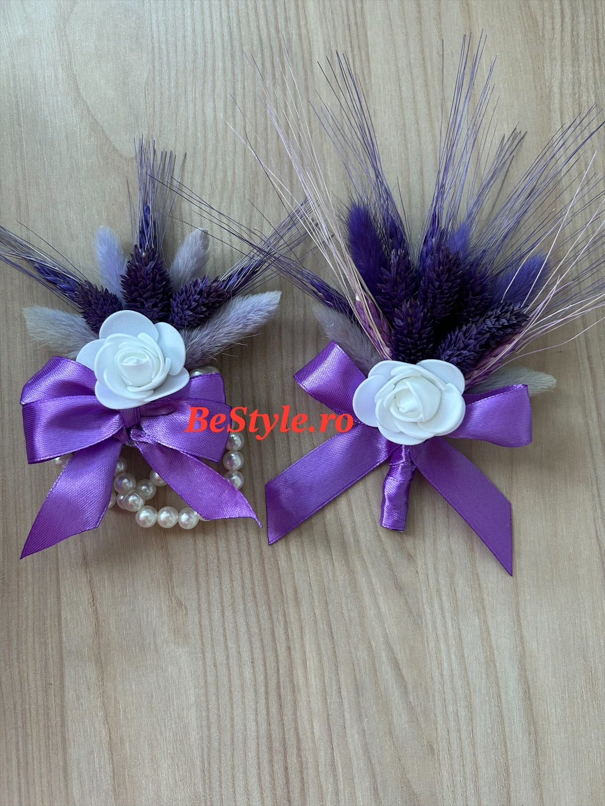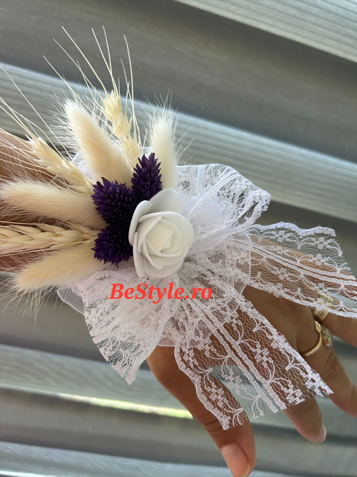 Floare de pus in piept pentru mire, pentru nas, brățară mireasa, brățară nașa, cu trandafir alb si flori uscate si stabilizate pe mov, lila, alb.