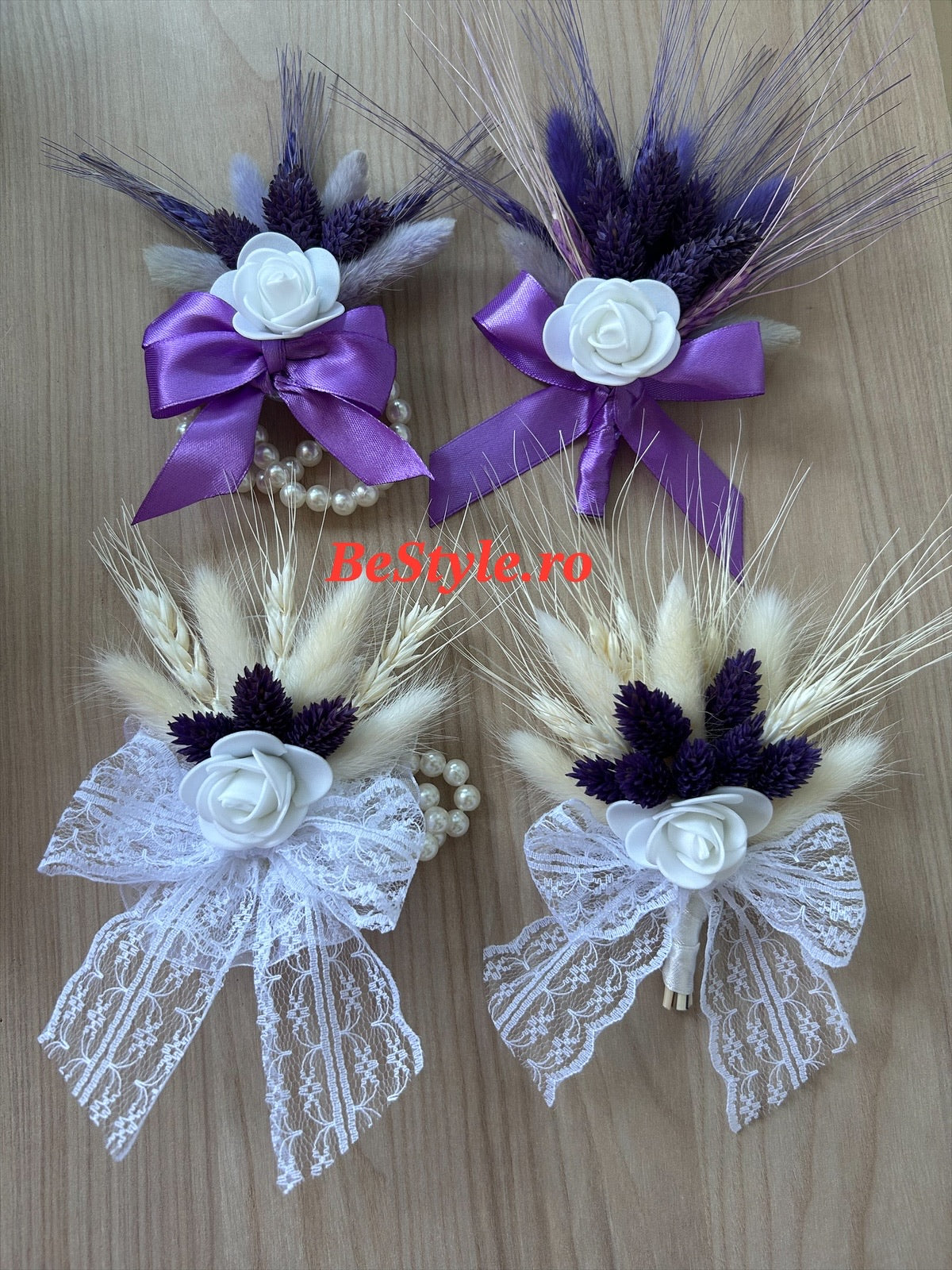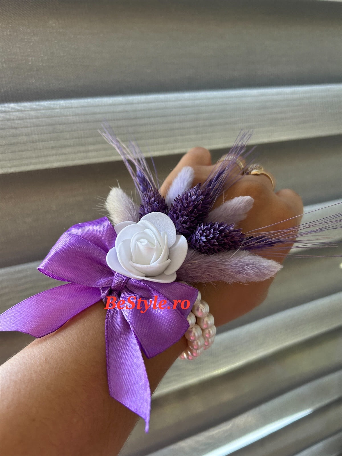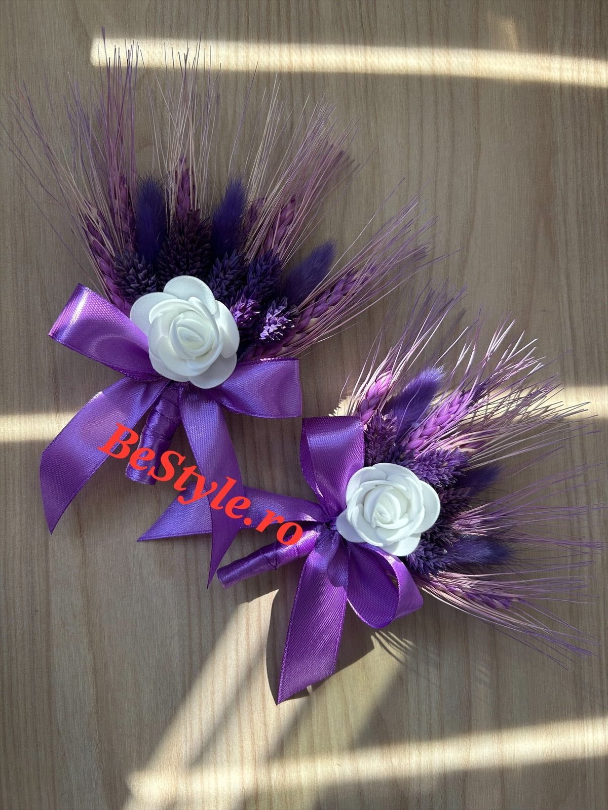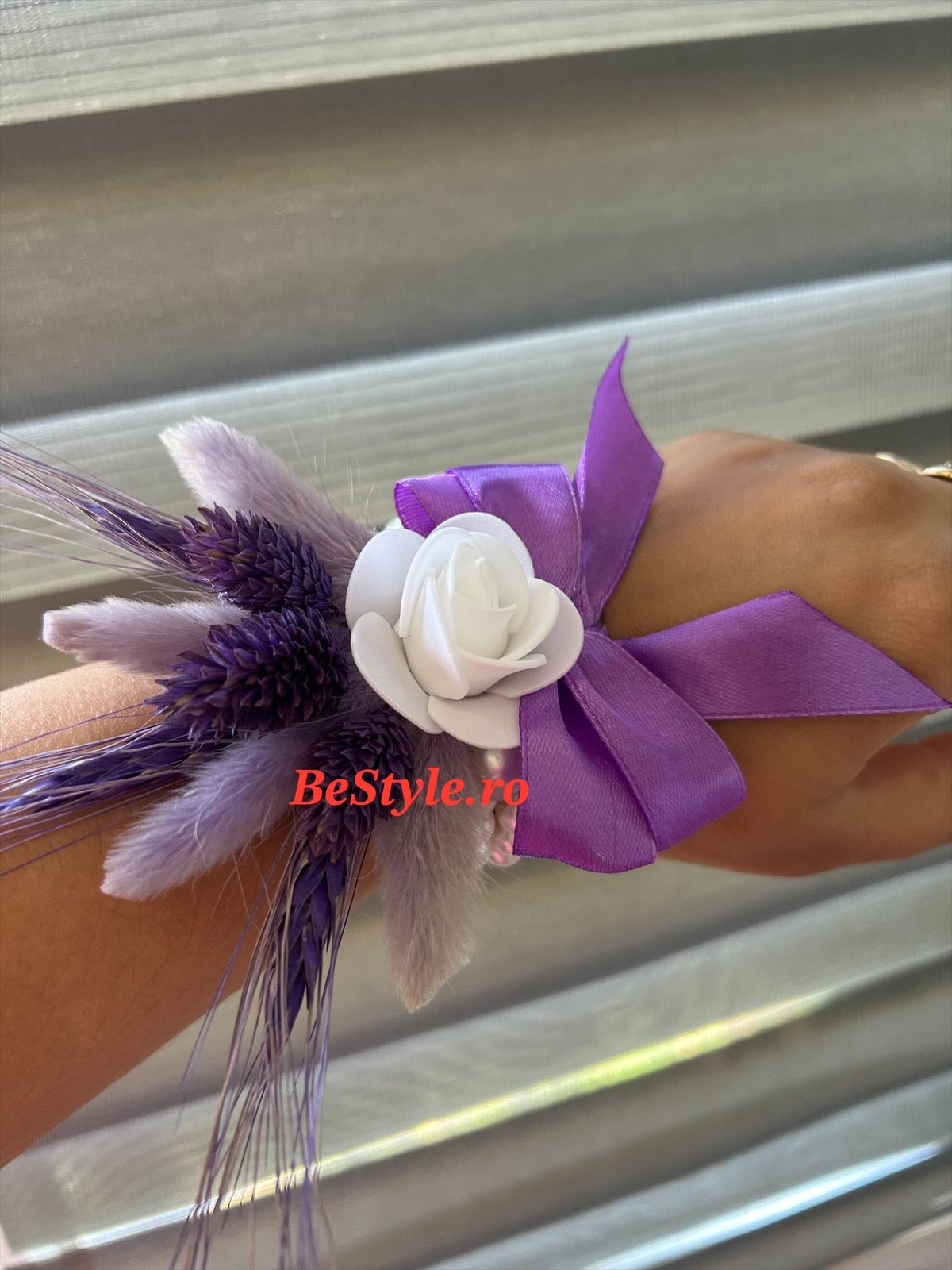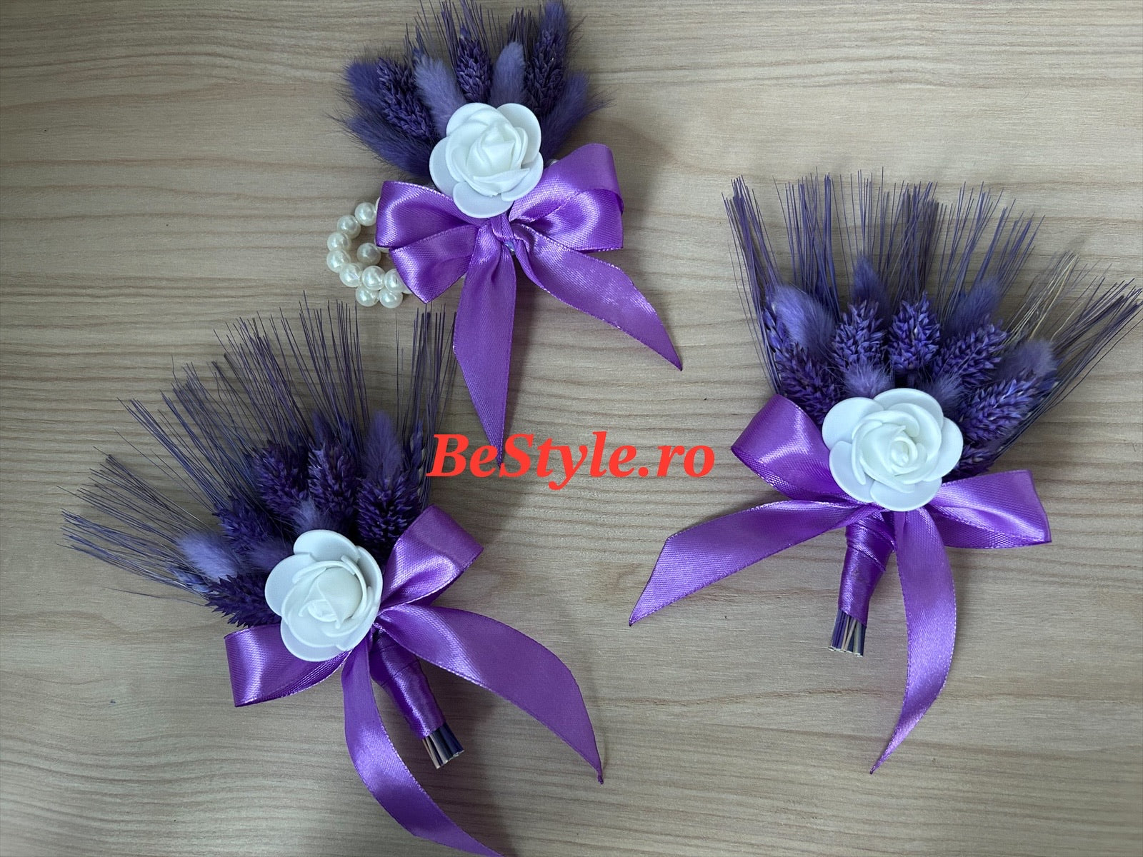 Floare de pus in piept pentru mire, pentru nas, brățară mireasa, brățară nașa, cu trandafir alb si flori uscate si stabilizate pe mov, lila, alb.