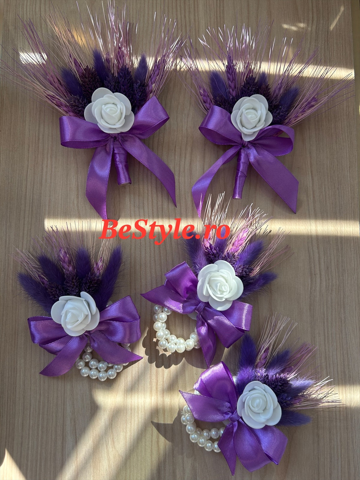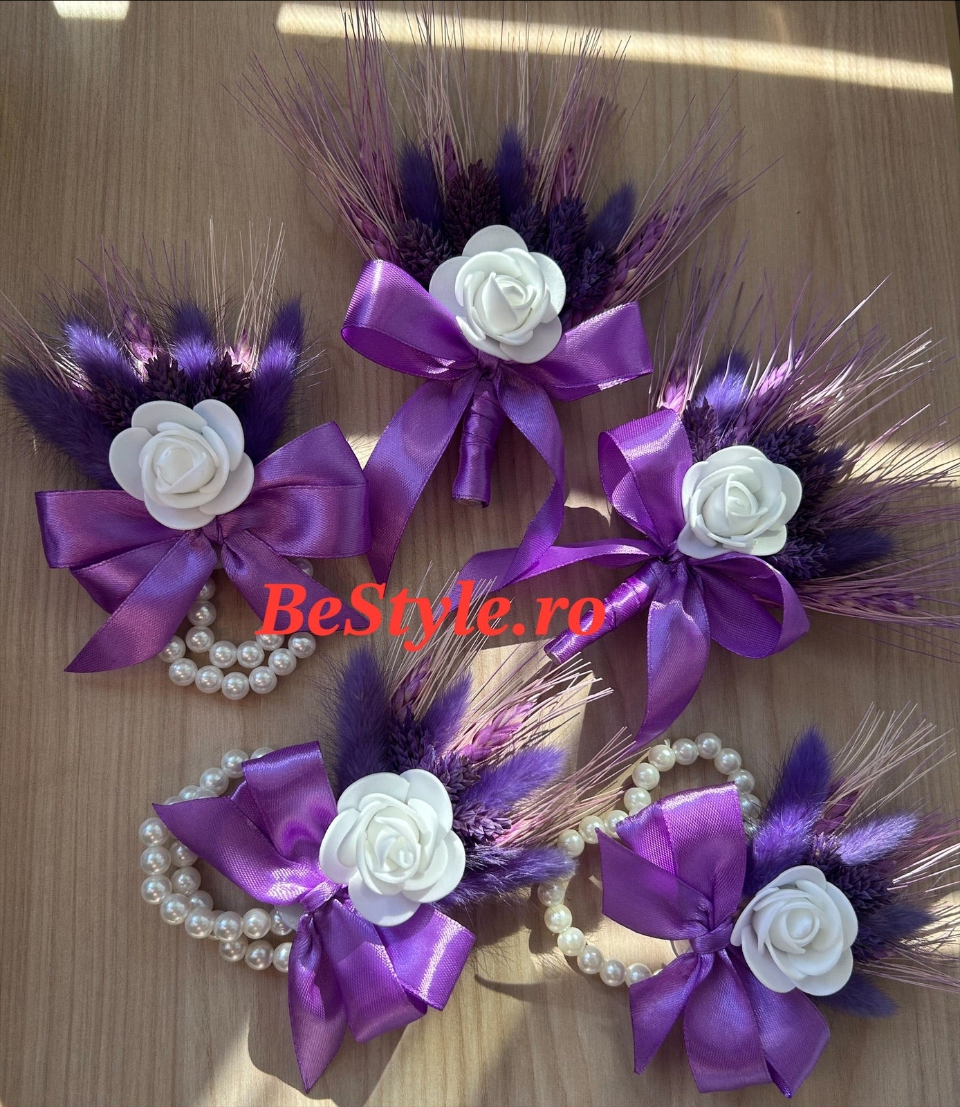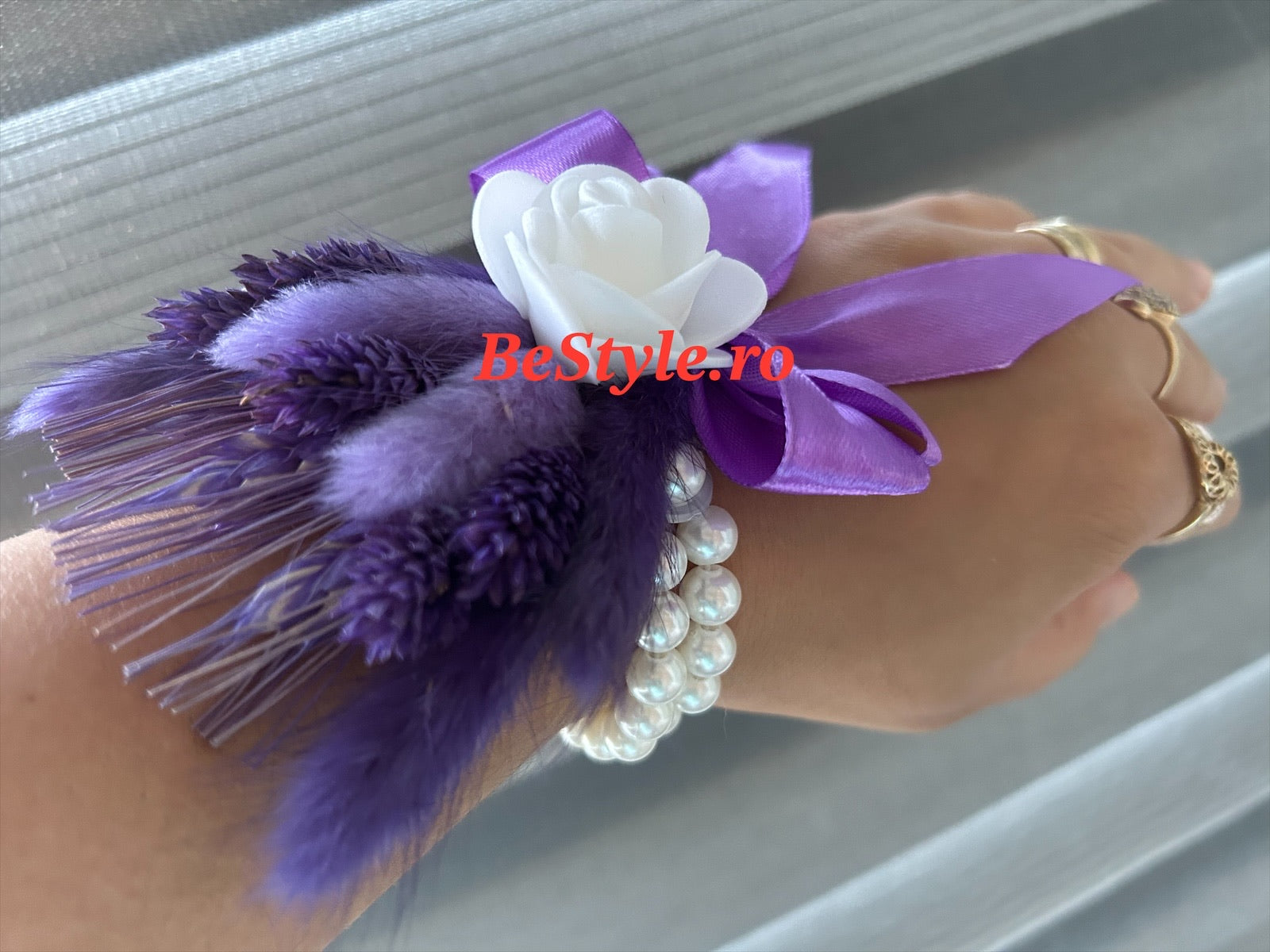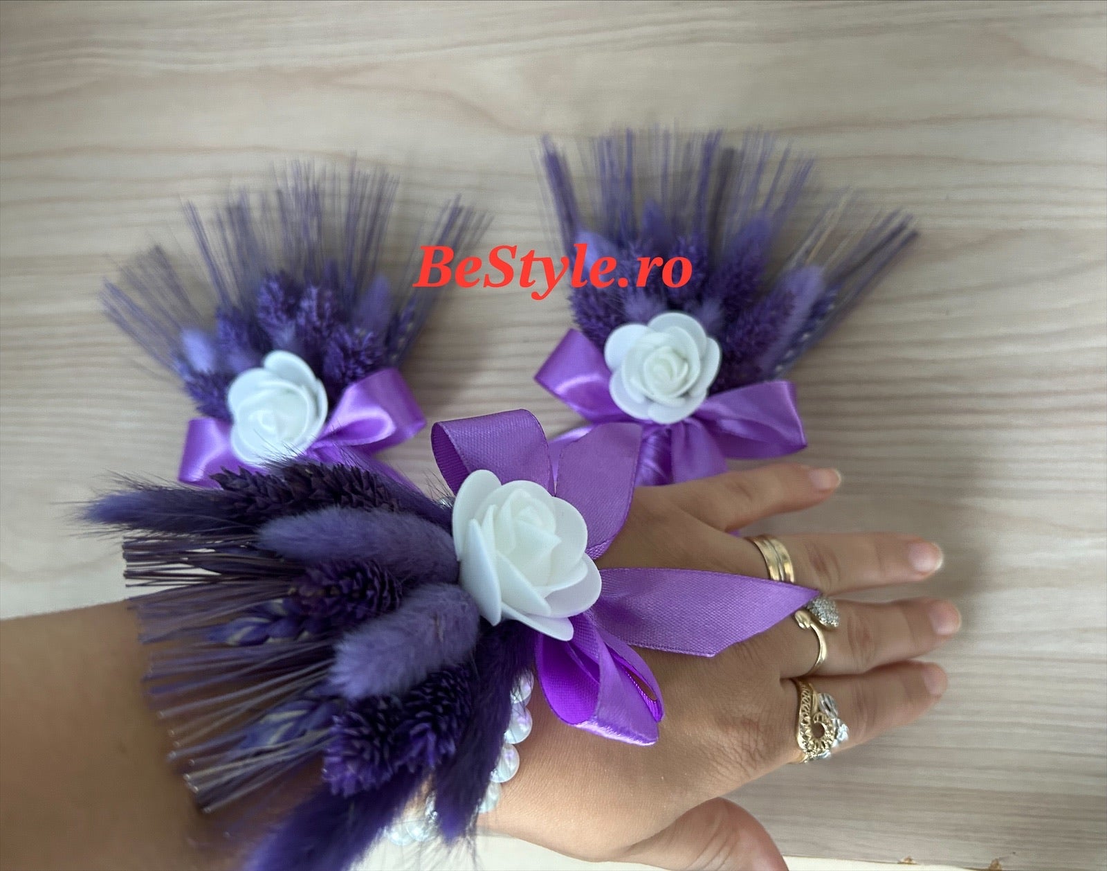 Floare de pus in piept pentru mire, pentru nas, brățară mireasa, brățară nașa, cu trandafir alb si flori uscate si stabilizate pe mov, lila, alb.