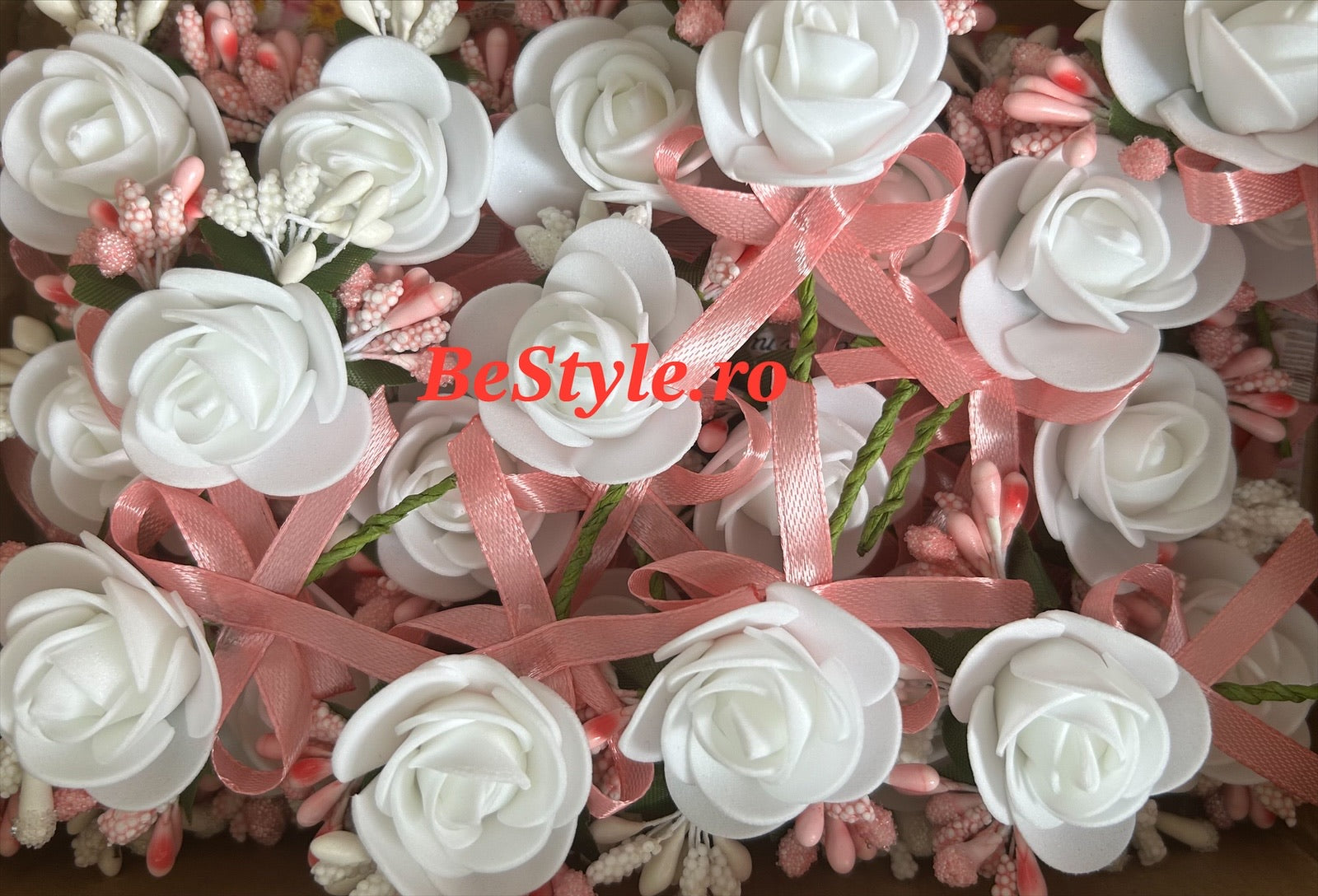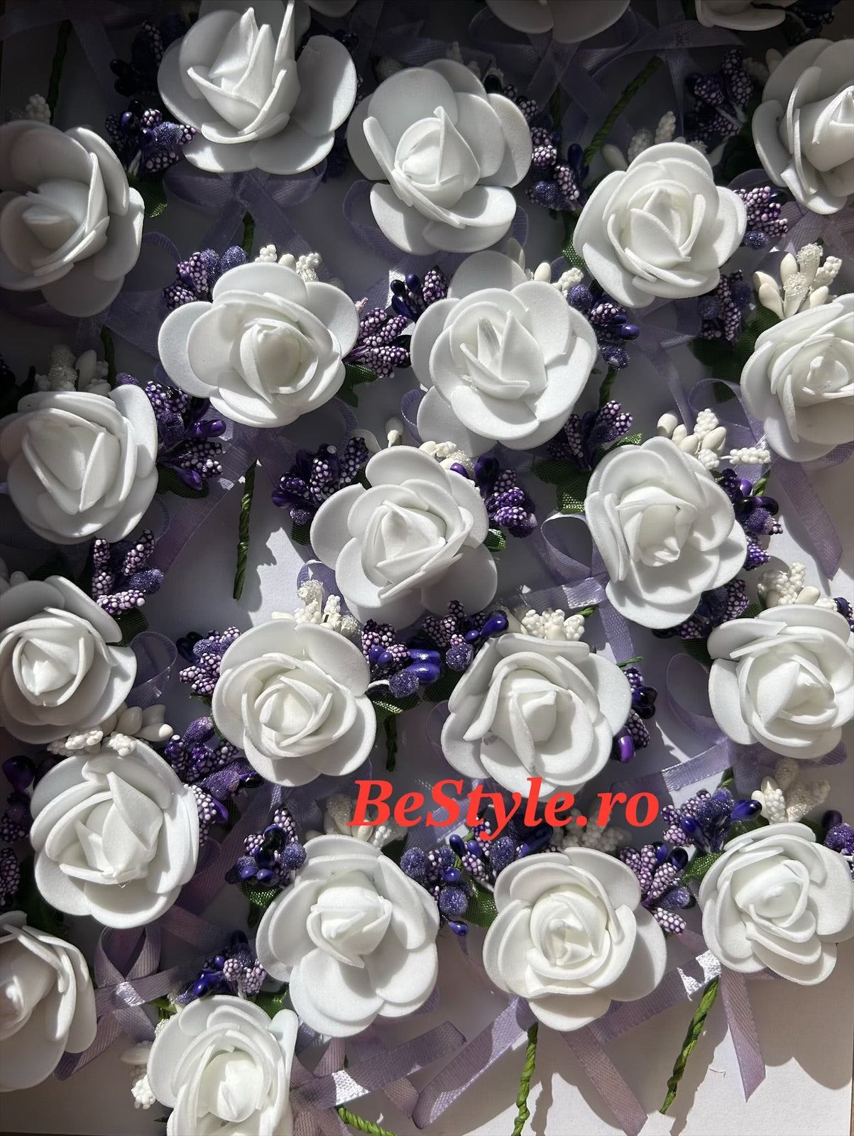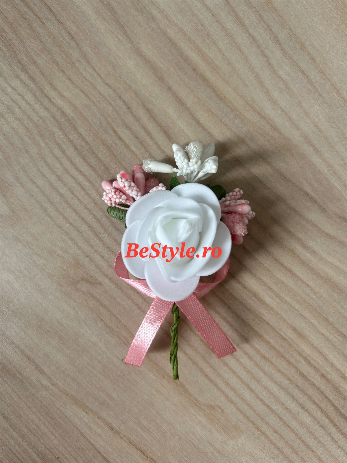 Floare de pus in piept invitati nunta, cu trandafir si fundita, alb, mov, lila, roz pudrat.