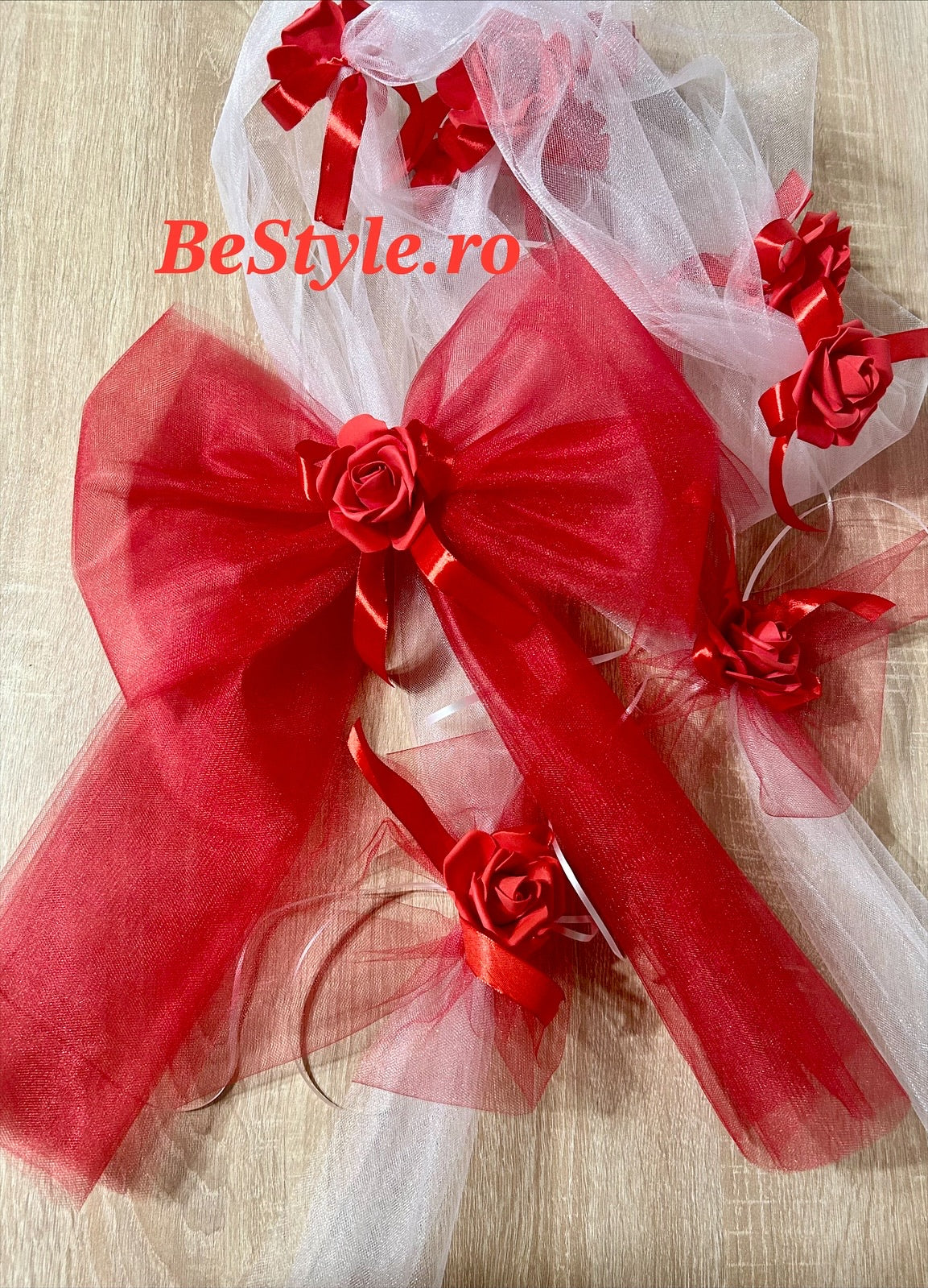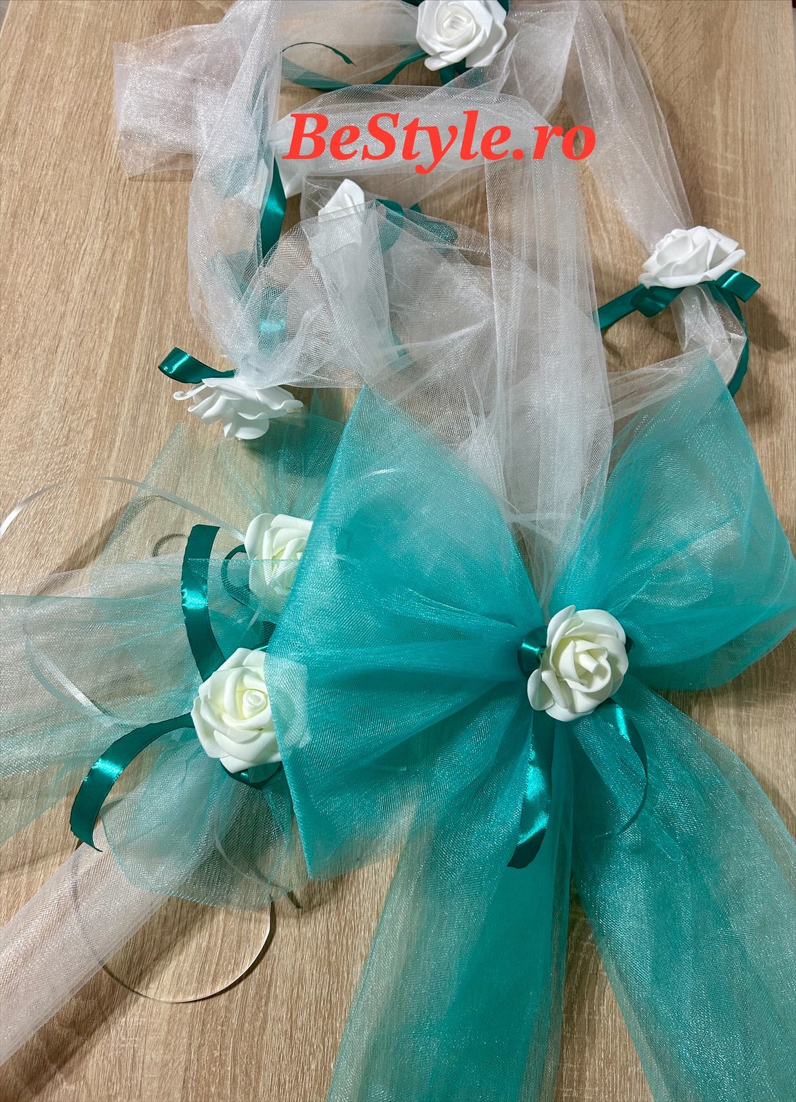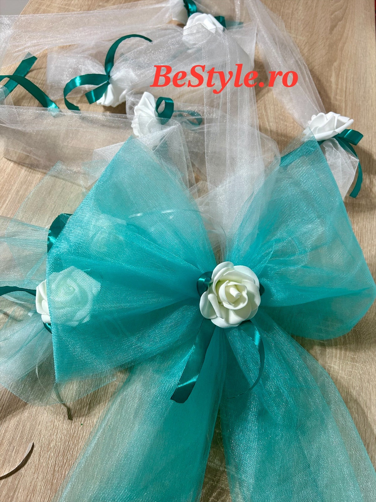 Fundite capota si oglinzi masina nunta prinse intre ele cu tul, decorat cu trandafiri, pe mov, lila, alb, verde, roz pudrat, roșu, turquoise spre verde.