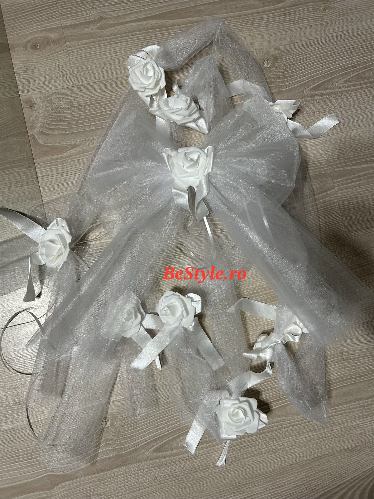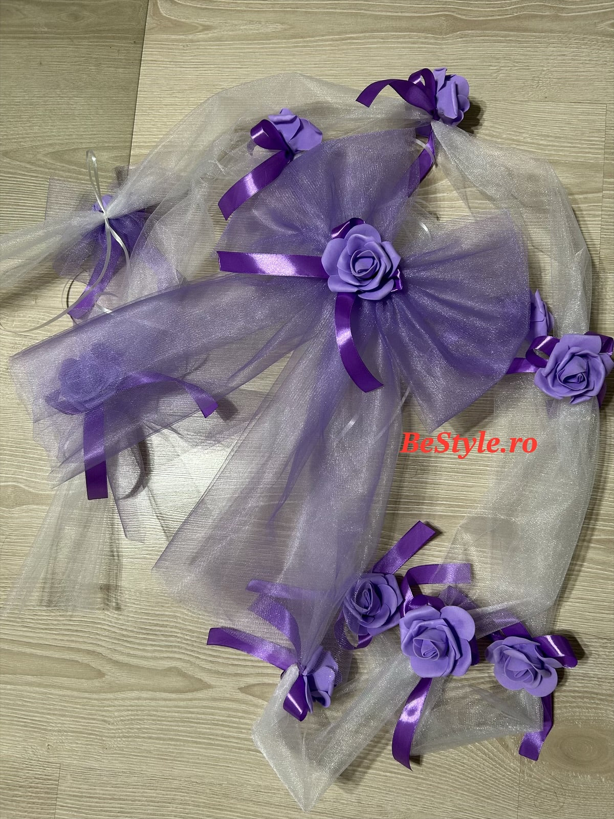 Fundite capota si oglinzi masina nunta prinse intre ele cu tul, decorat cu trandafiri, pe mov, lila, alb, verde, roz pudrat.