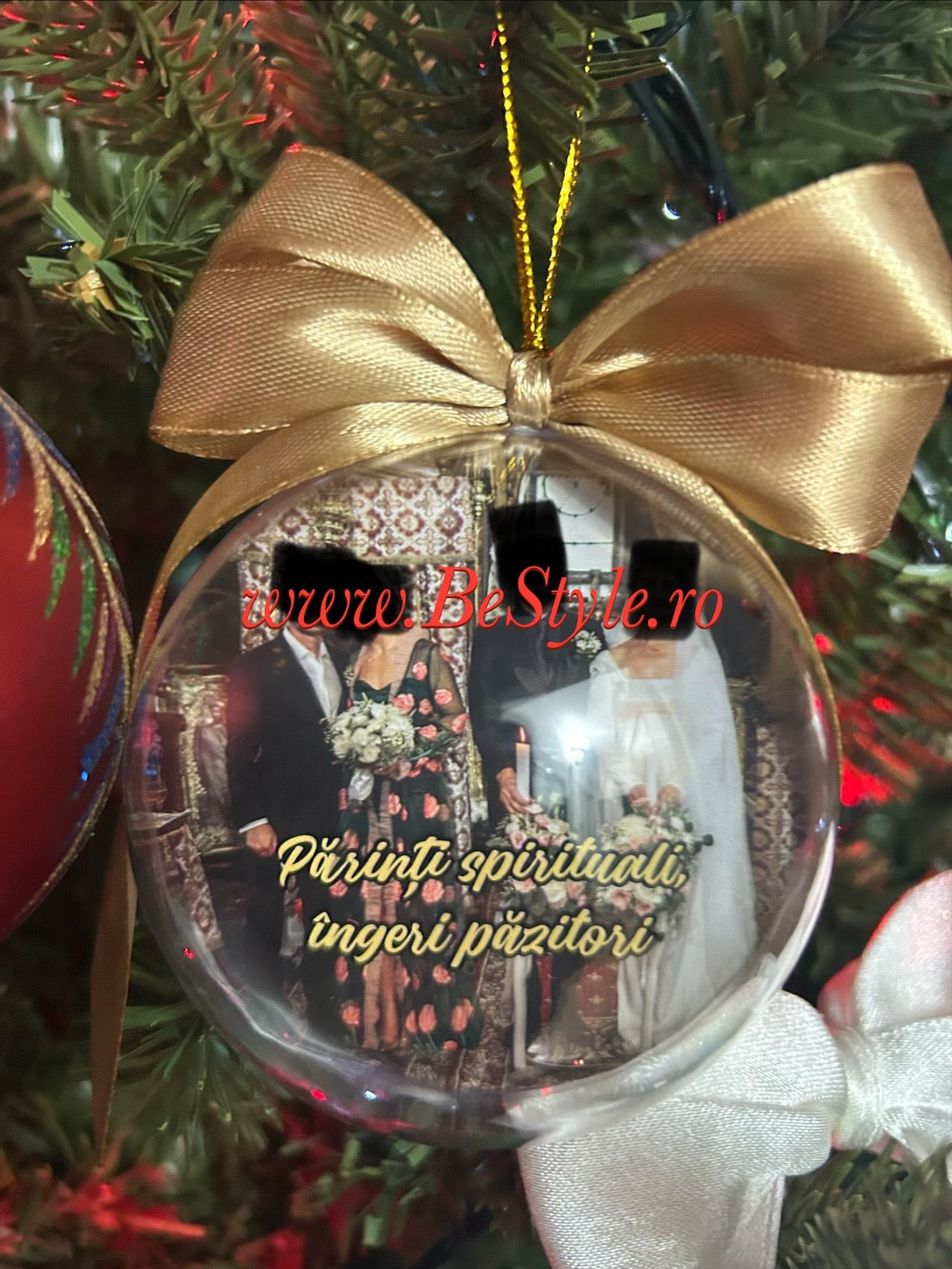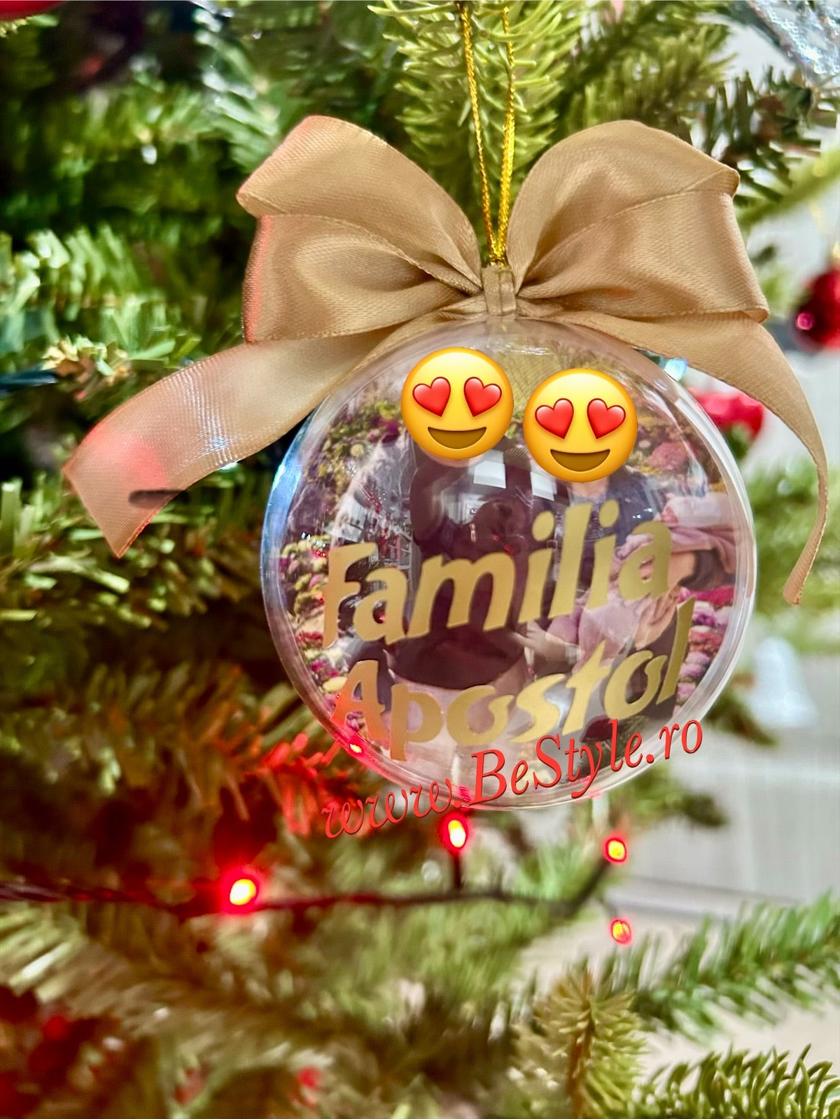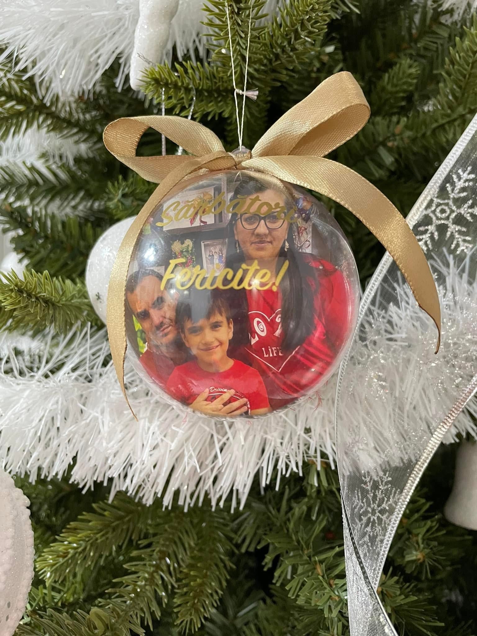 Glob pentru bradul de Craciun personalizat cu fotografii pe ambele fete, de 8 cm diametrul.