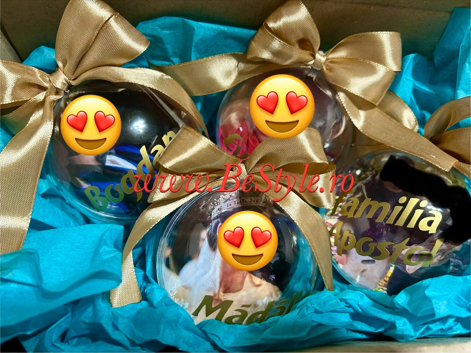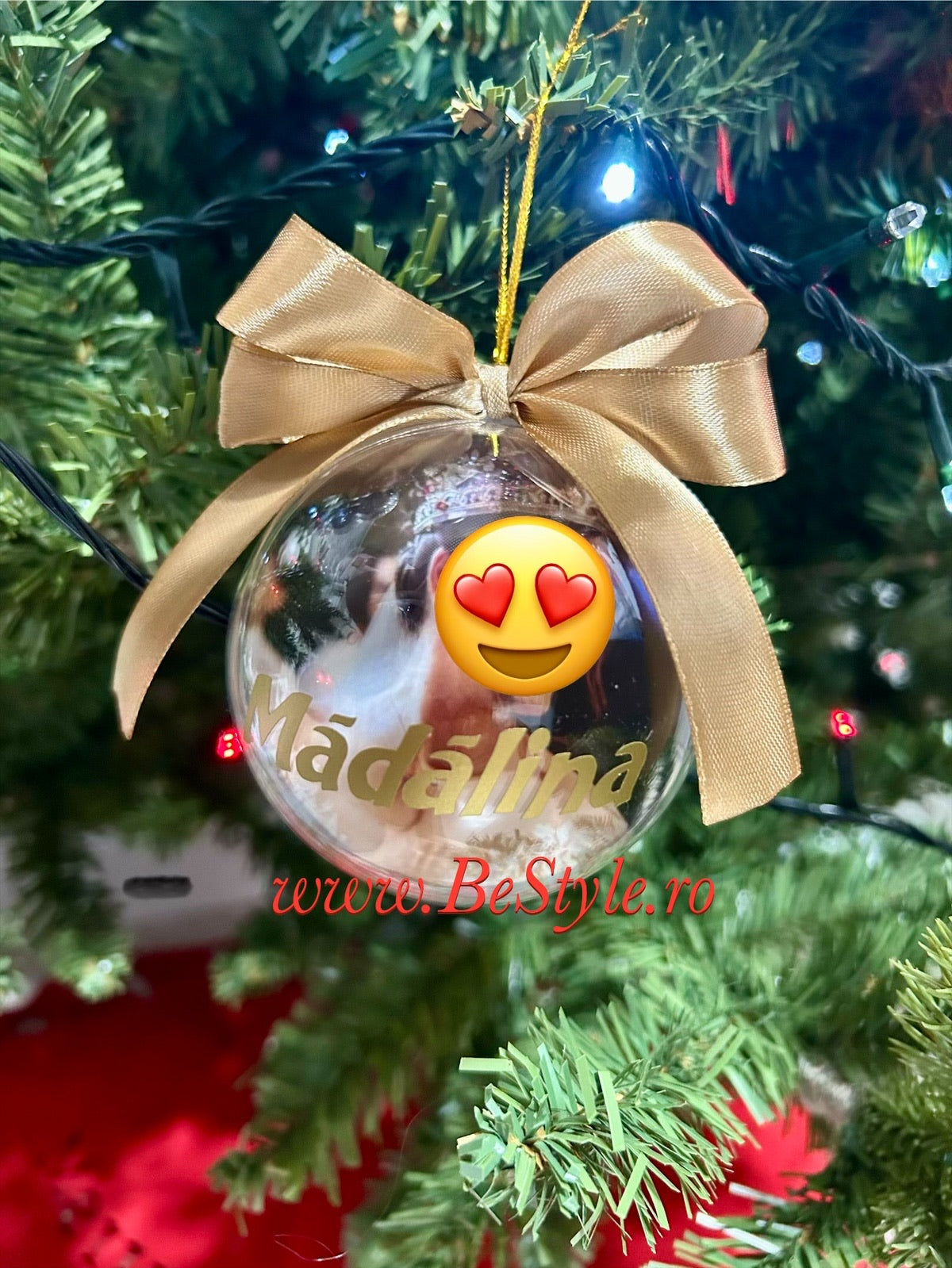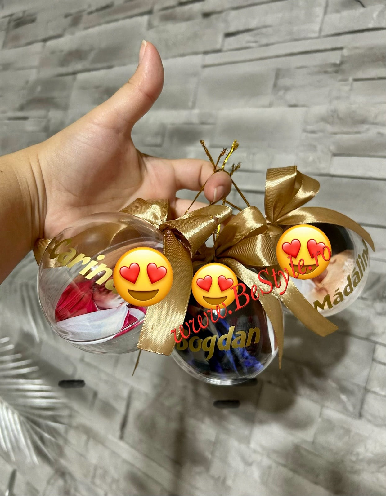 Glob pentru bradul de Craciun personalizat cu fotografii pe ambele fete, de 8 cm diametrul.