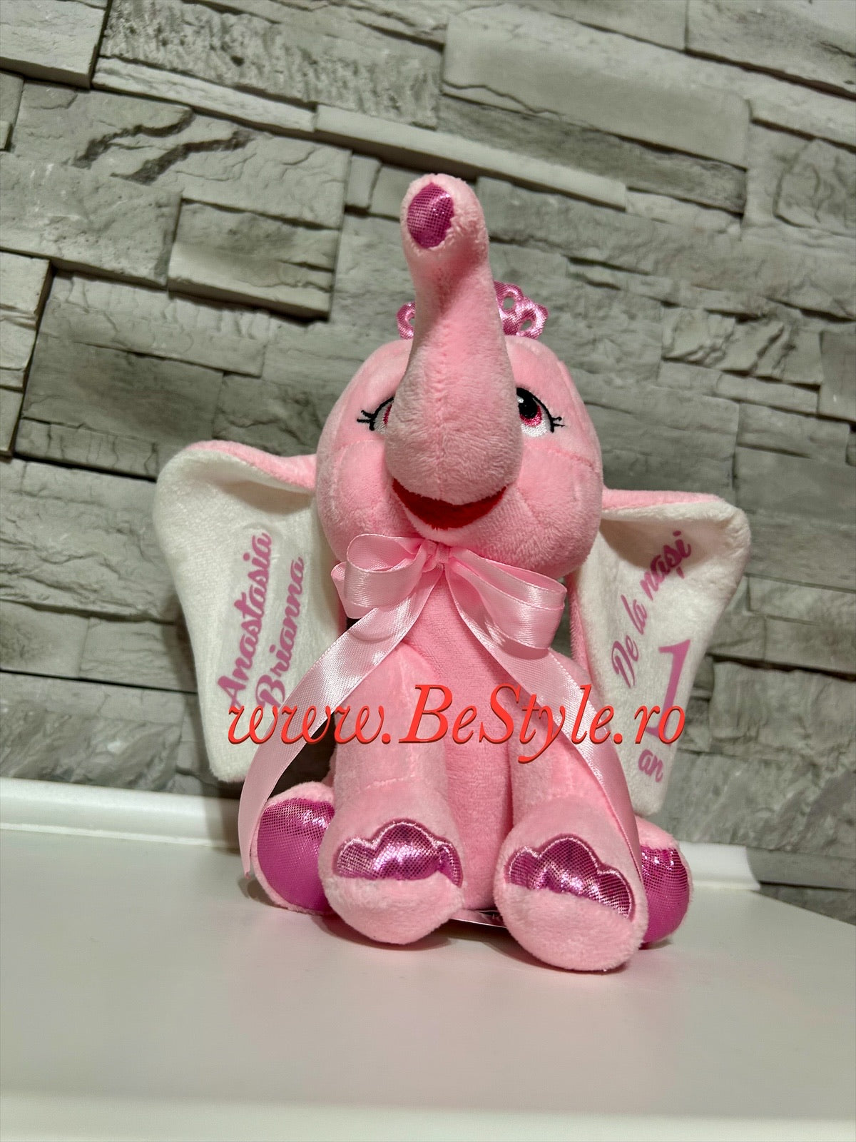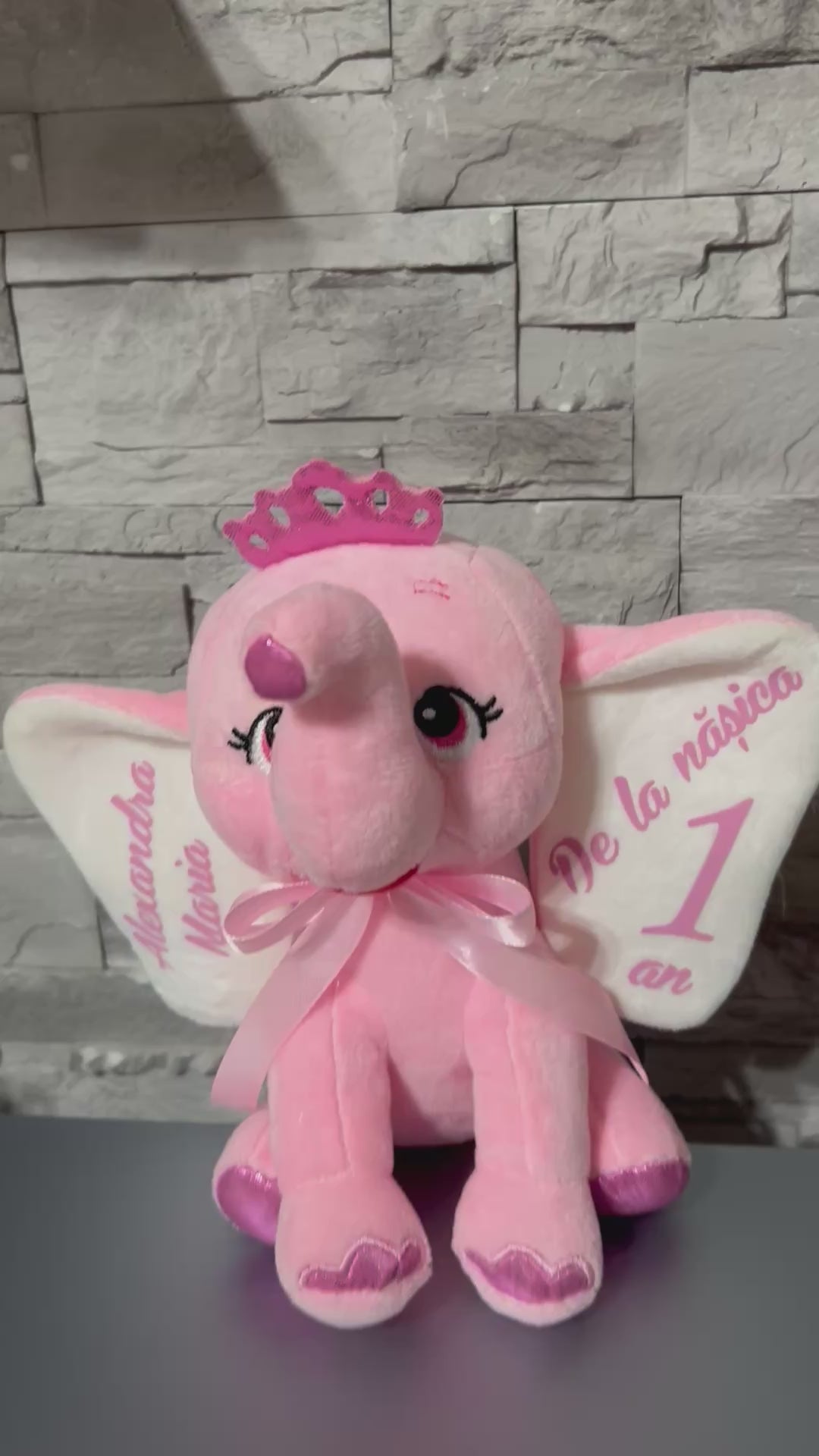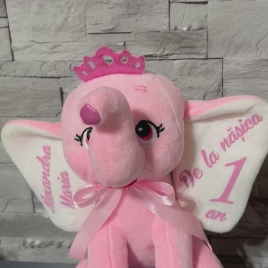 Jucărie pluș tip elefantul roz, personalizat cu nume și mesaj pe ambele urechi. Se realizează doar pe comandă, cu mesajul dorit.