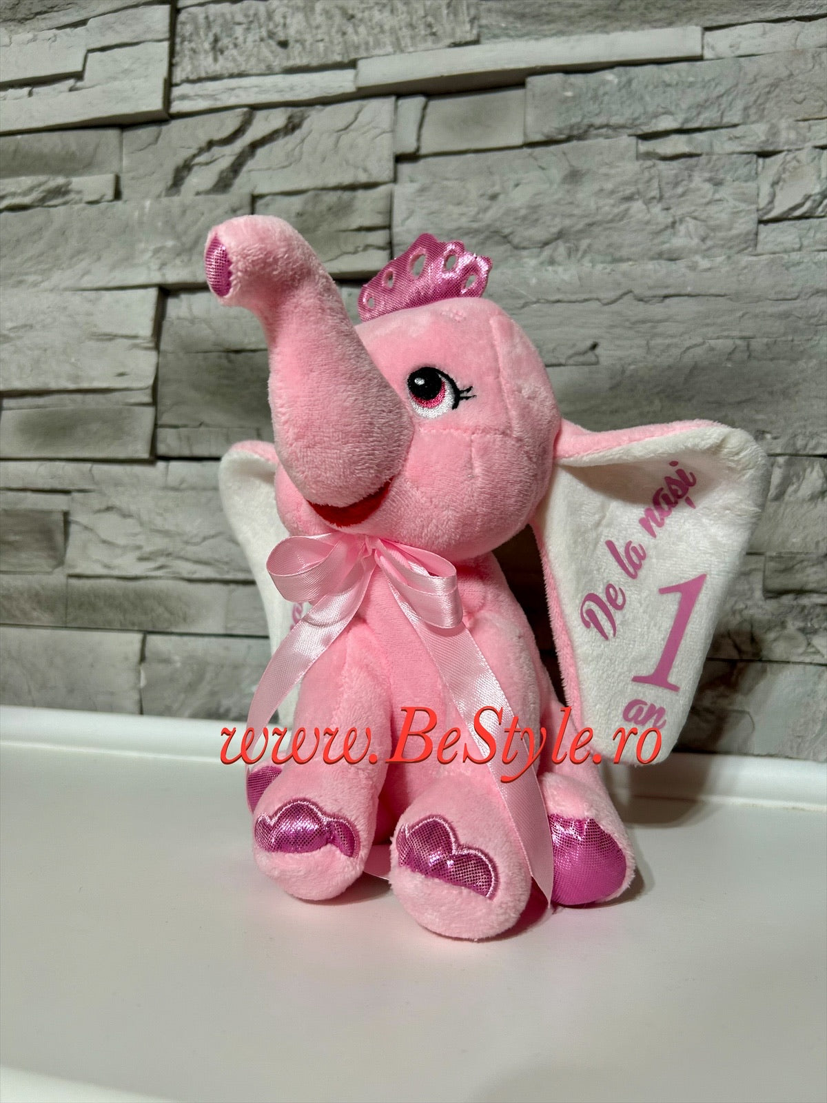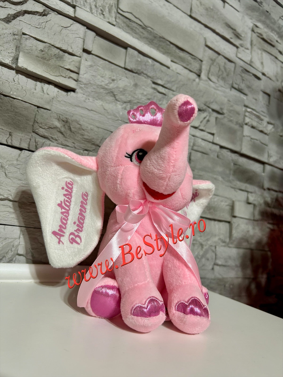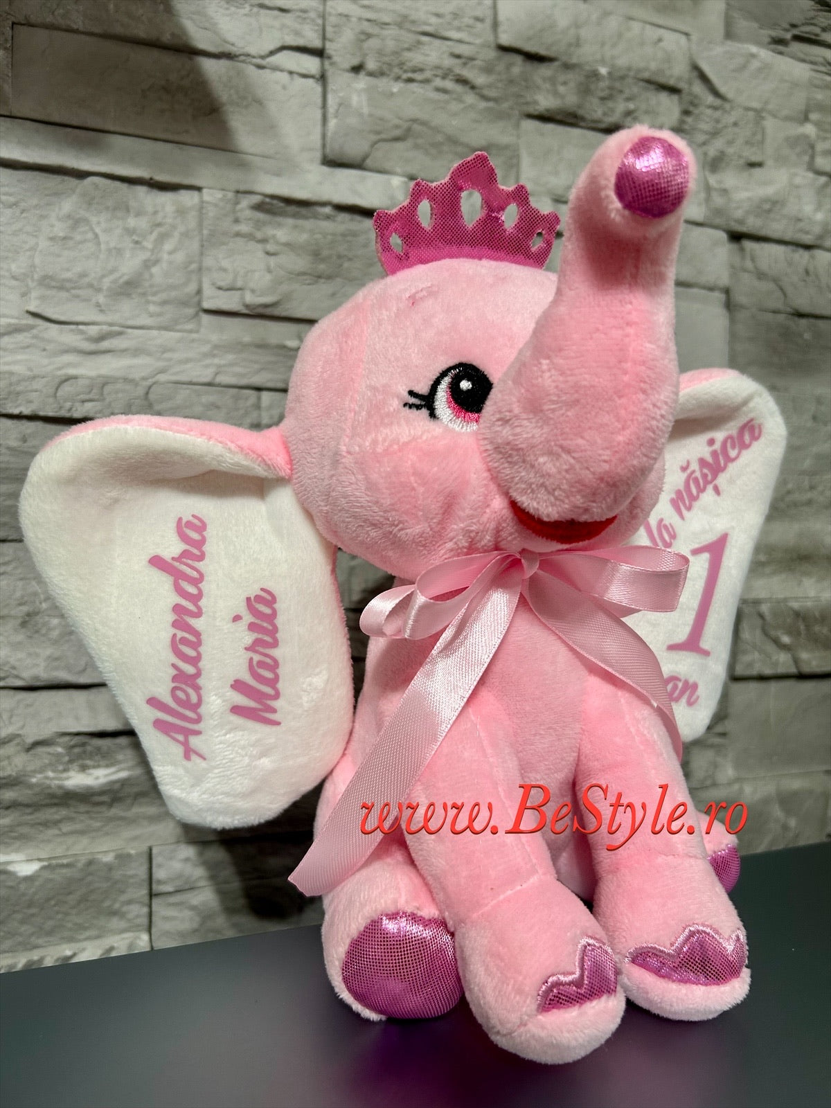 Jucărie pluș tip elefantul roz, personalizat cu nume și mesaj pe ambele urechi. Se realizează doar pe comandă, cu mesajul dorit.