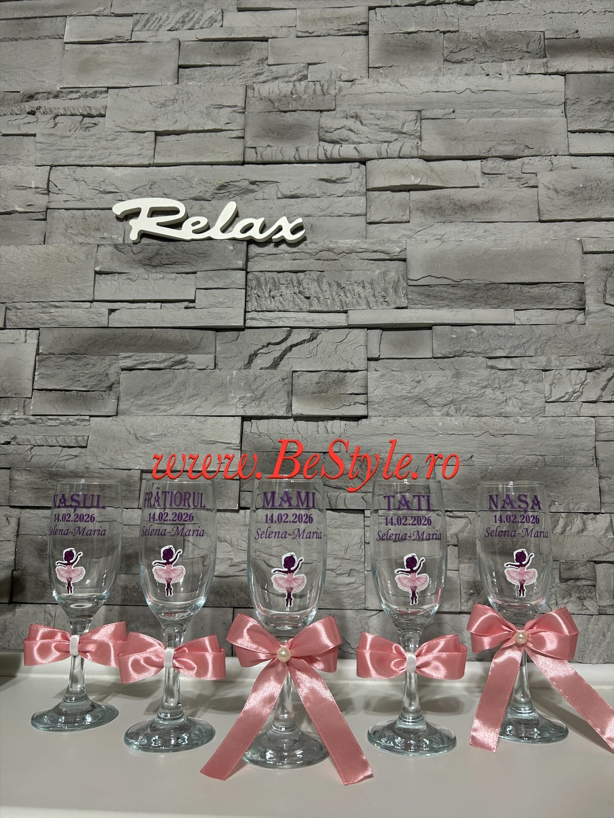 Pahar personalizat botez fetita cu balerina, pentru mami, tati, nasa, nasul, frățiorul, cu nume, data și fundițe atașate pe picior.