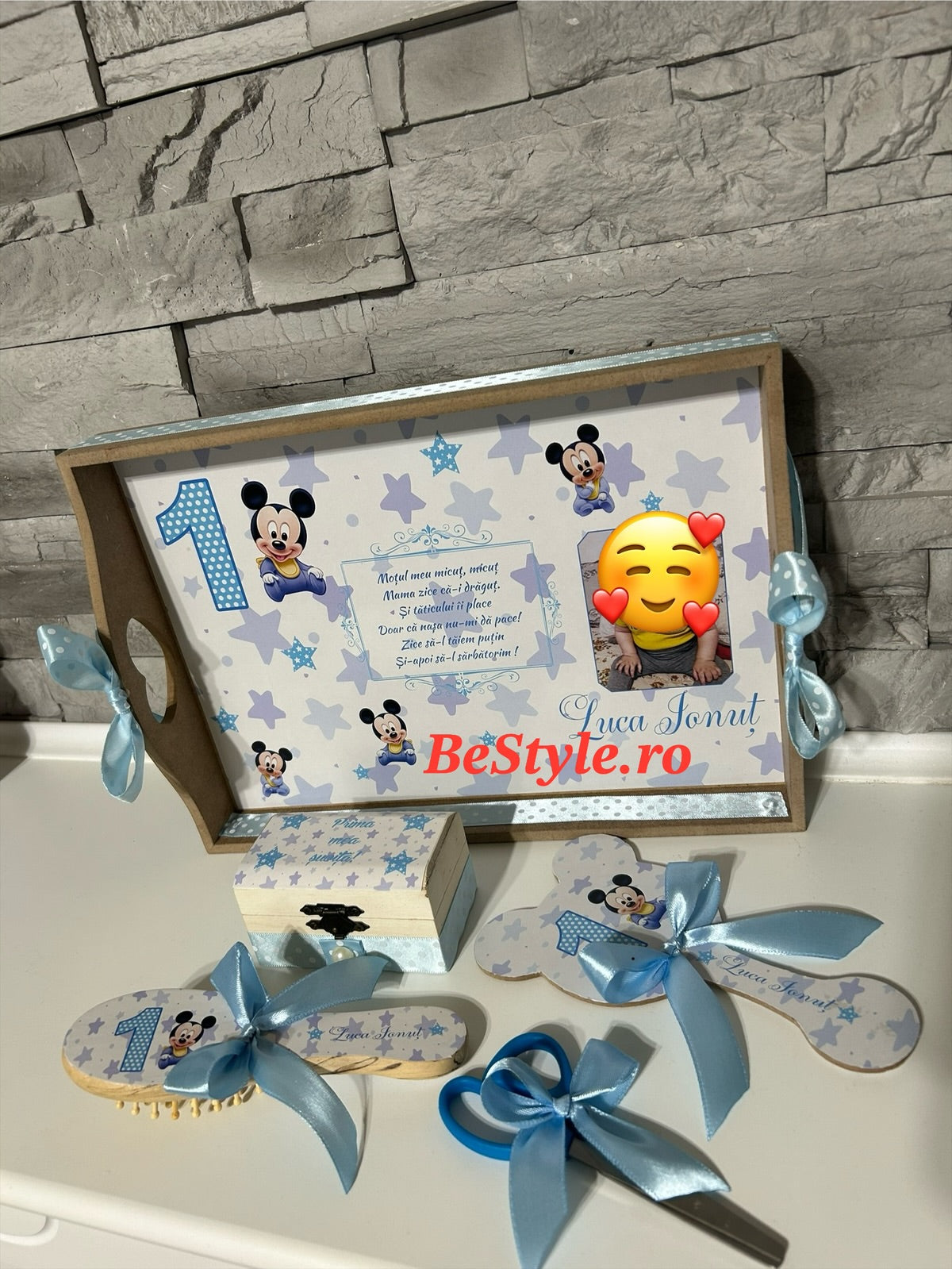 Set tavita taiere mot baietel, personalizata cu fotografia copilului, mesajul dorit si este realizat pe tematica din desenele animate Mickey Mouse.