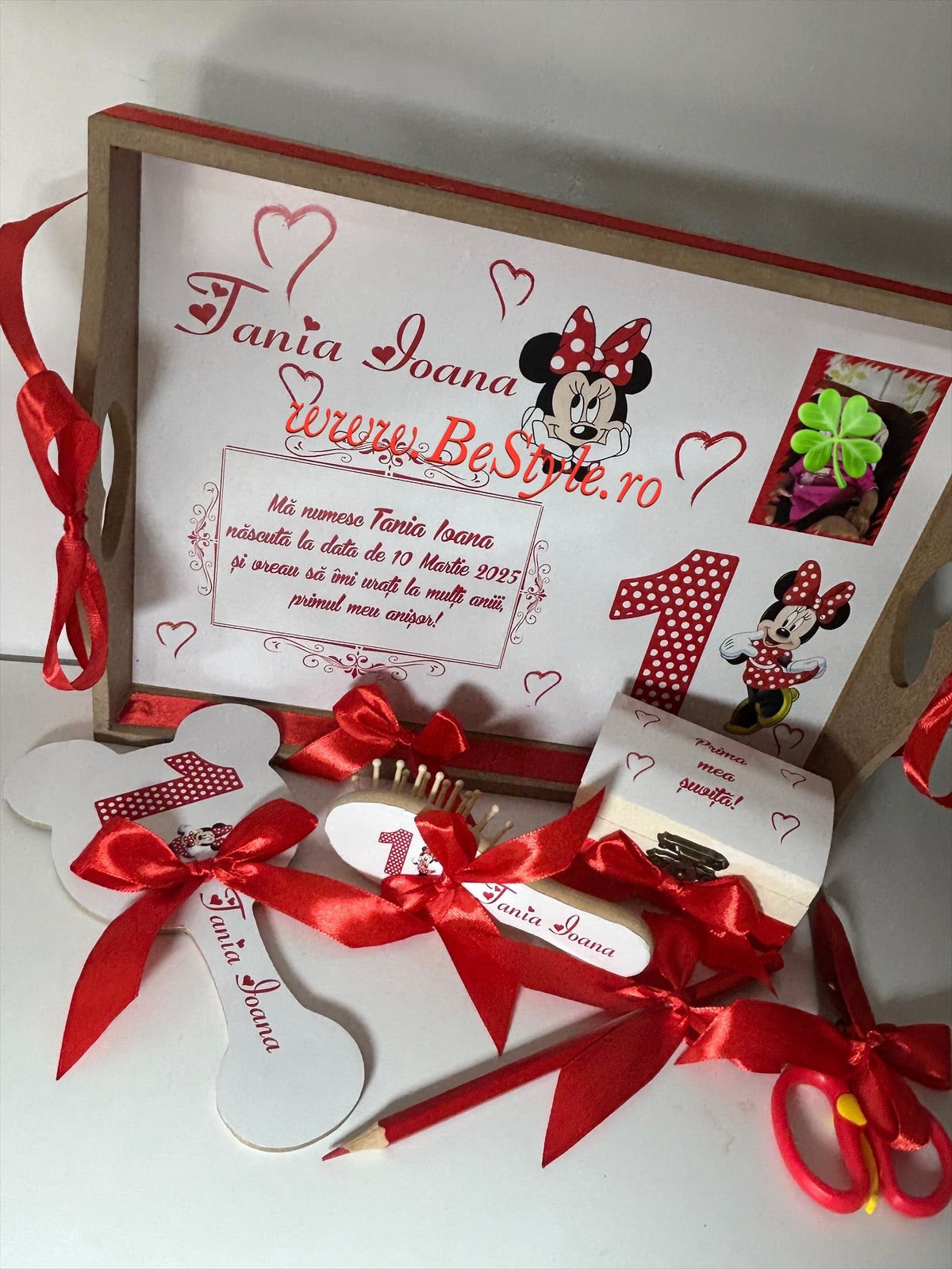 Set tavita taiere mot fetita, personalizata cu fotografia copilului, mesajul dorit si este realizat pe tematica din desenele animate Minnie Mouse.
