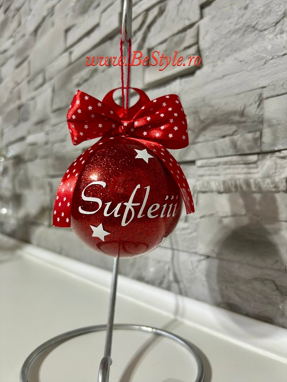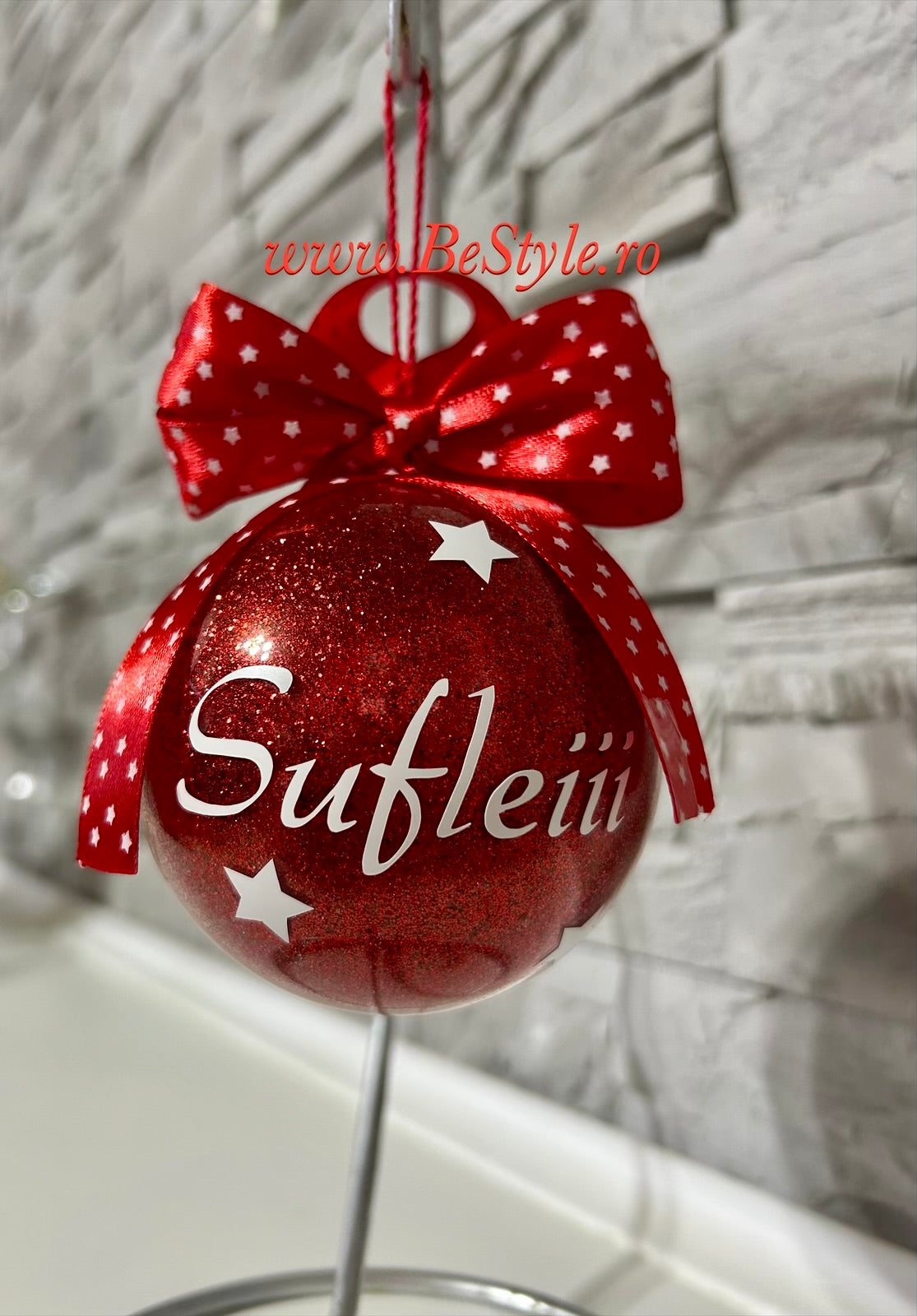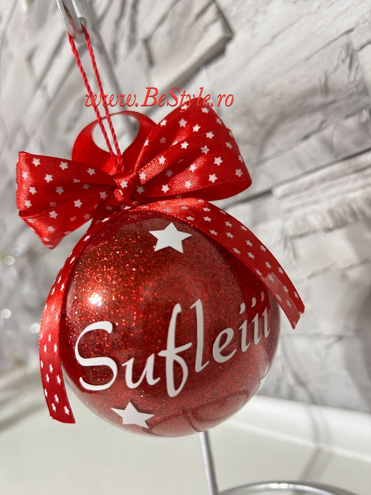 Glob pentru bradul de Craciun personalizat cu nume și steluțe pe ambele fete, de 8 cm diametrul, interior cu sclipici.