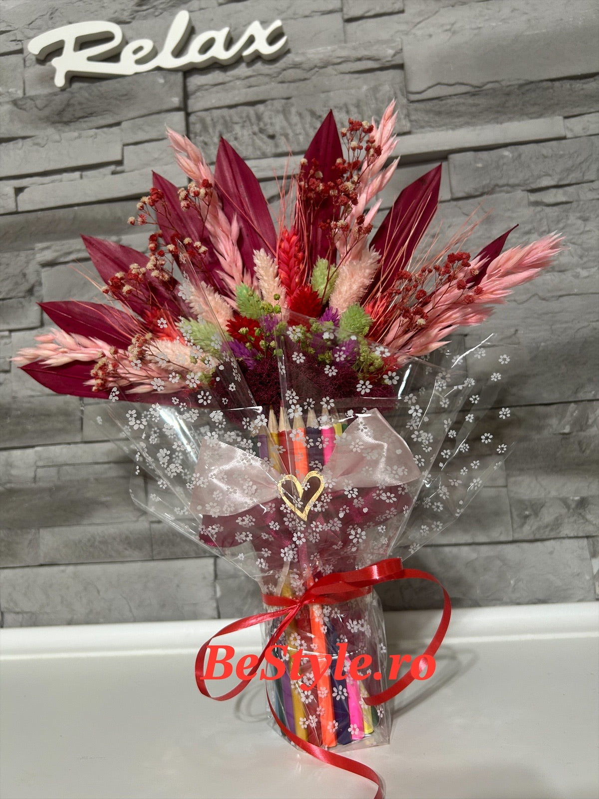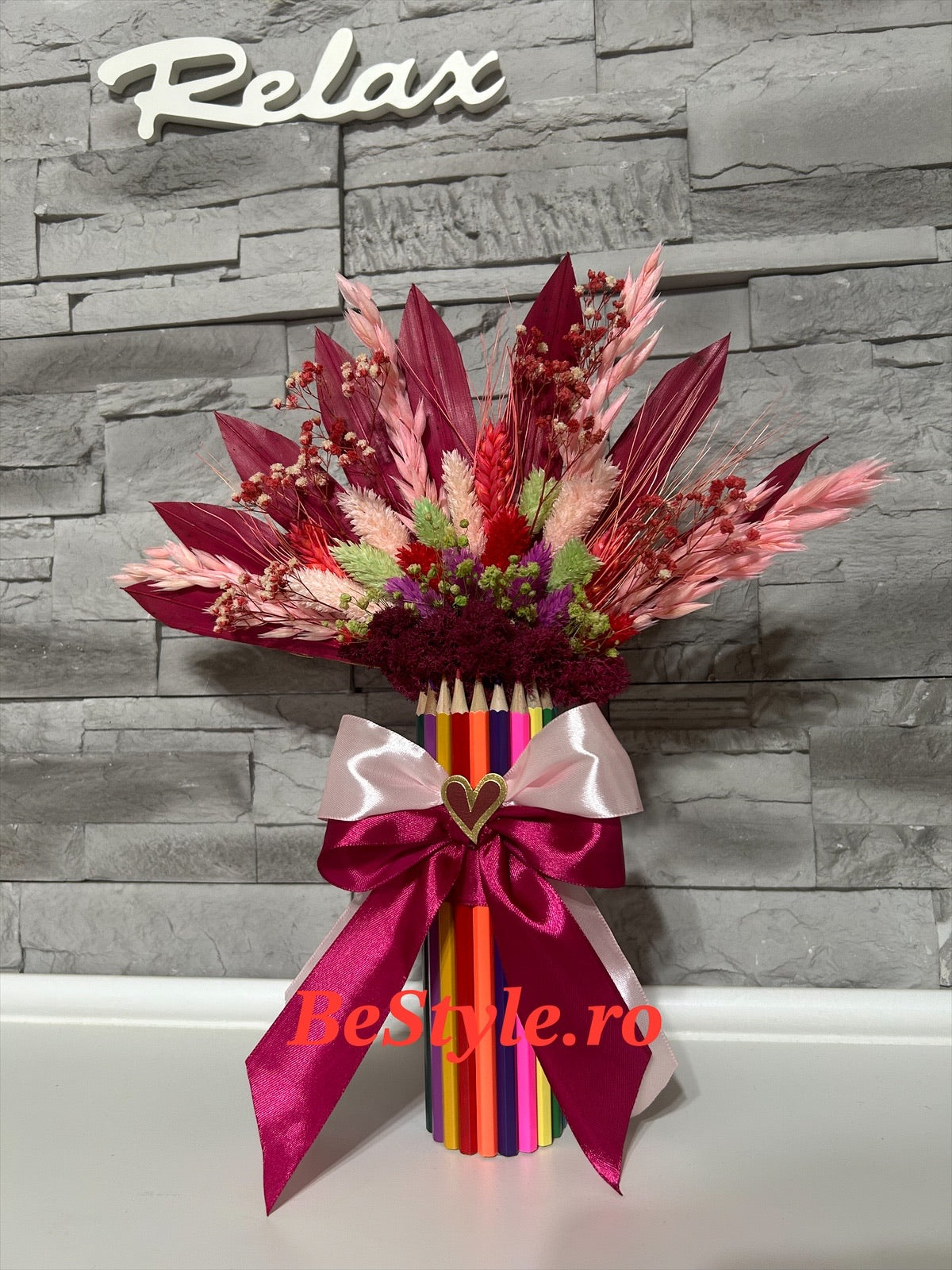 Aranjament din creioane colorate cu flori uscate si stabilizate pentru cadrele didactice.