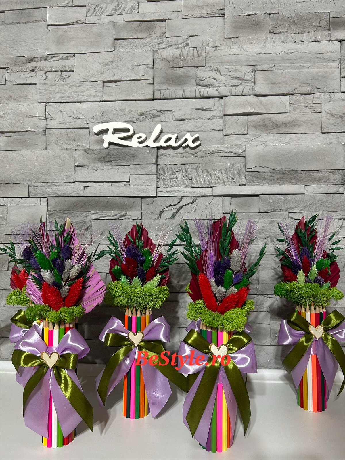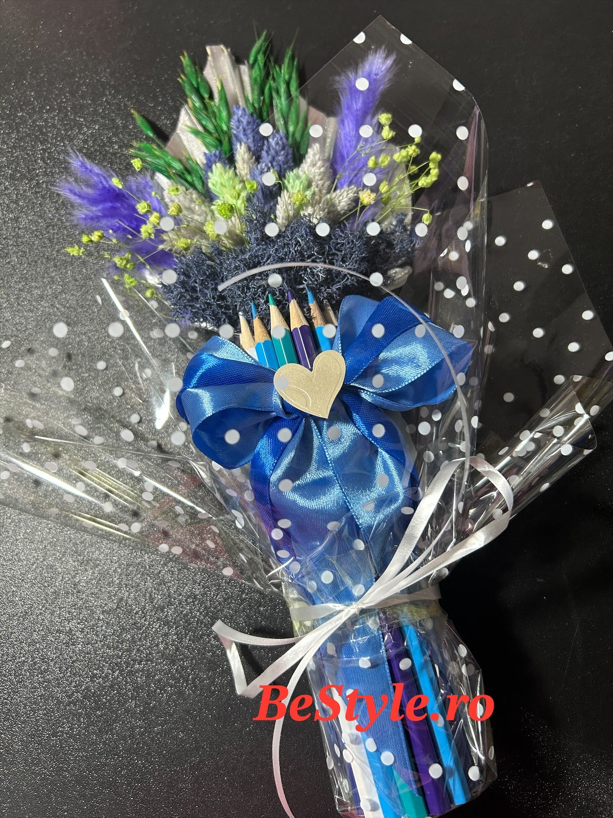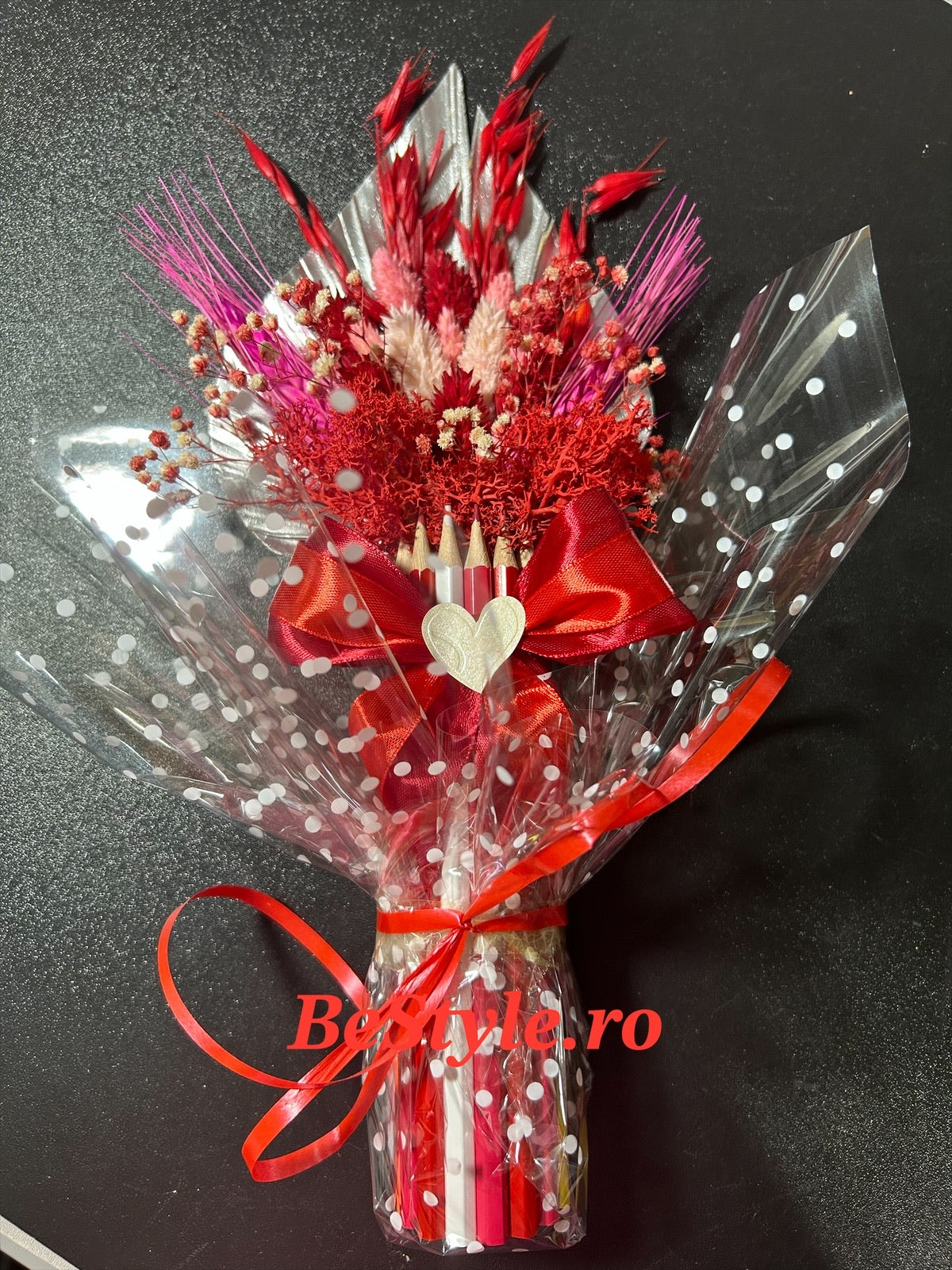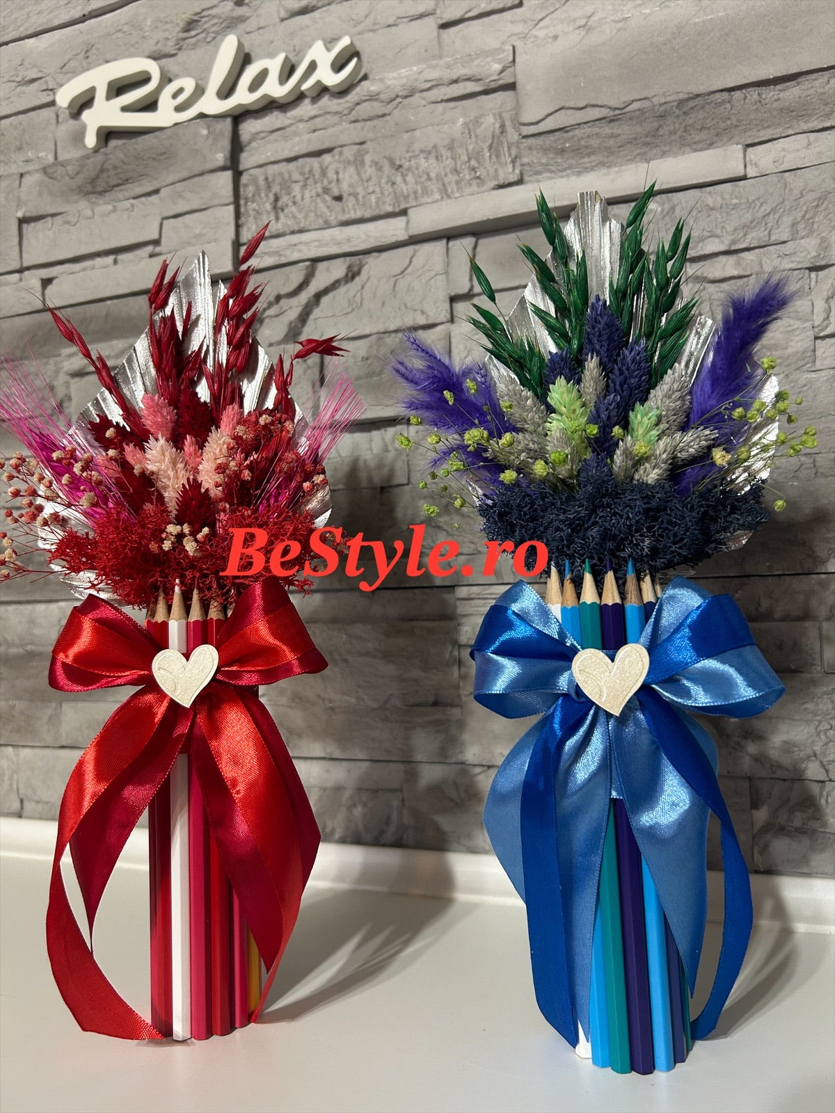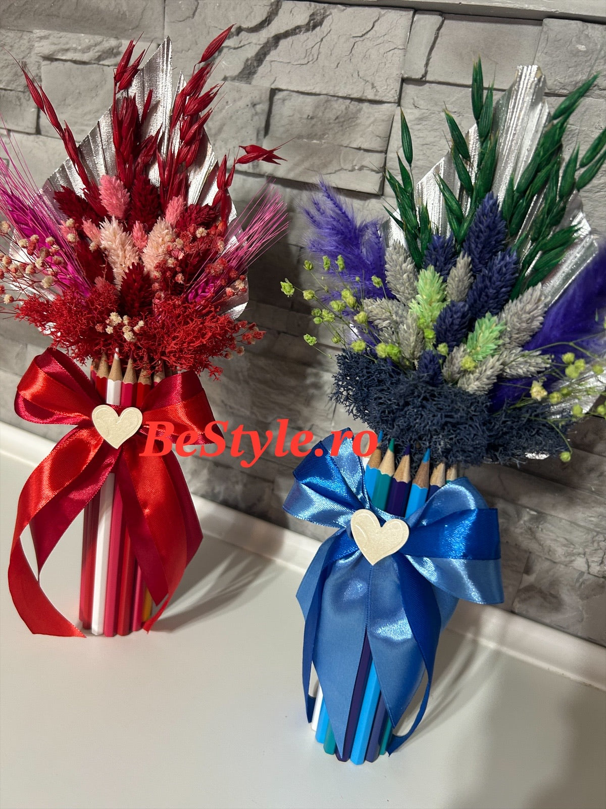 Aranjament din creioane colorate cu flori uscate si stabilizate pentru cadrele didactice.
